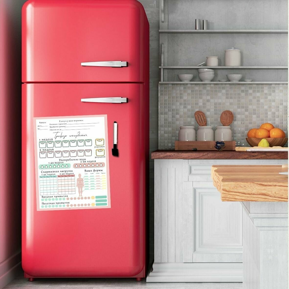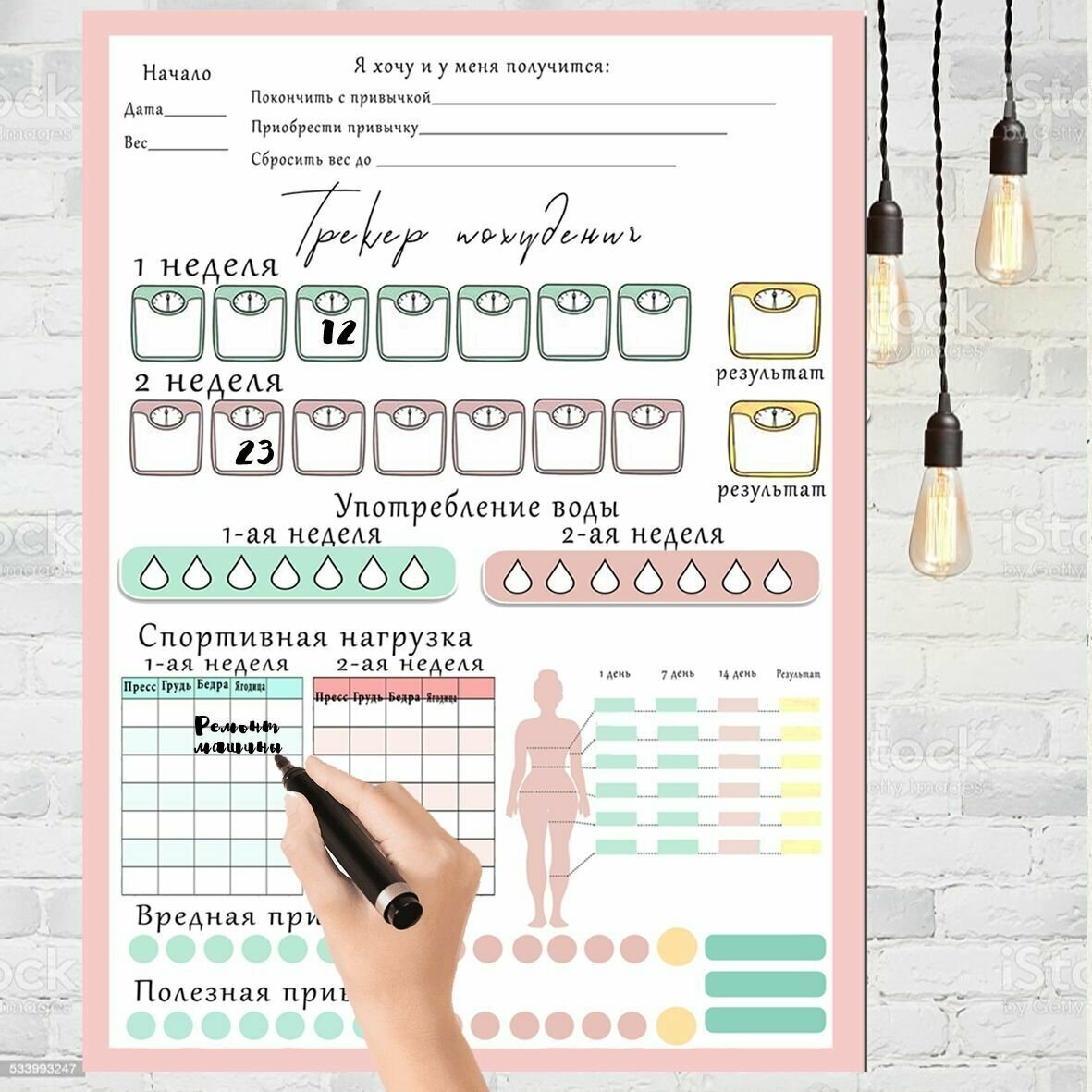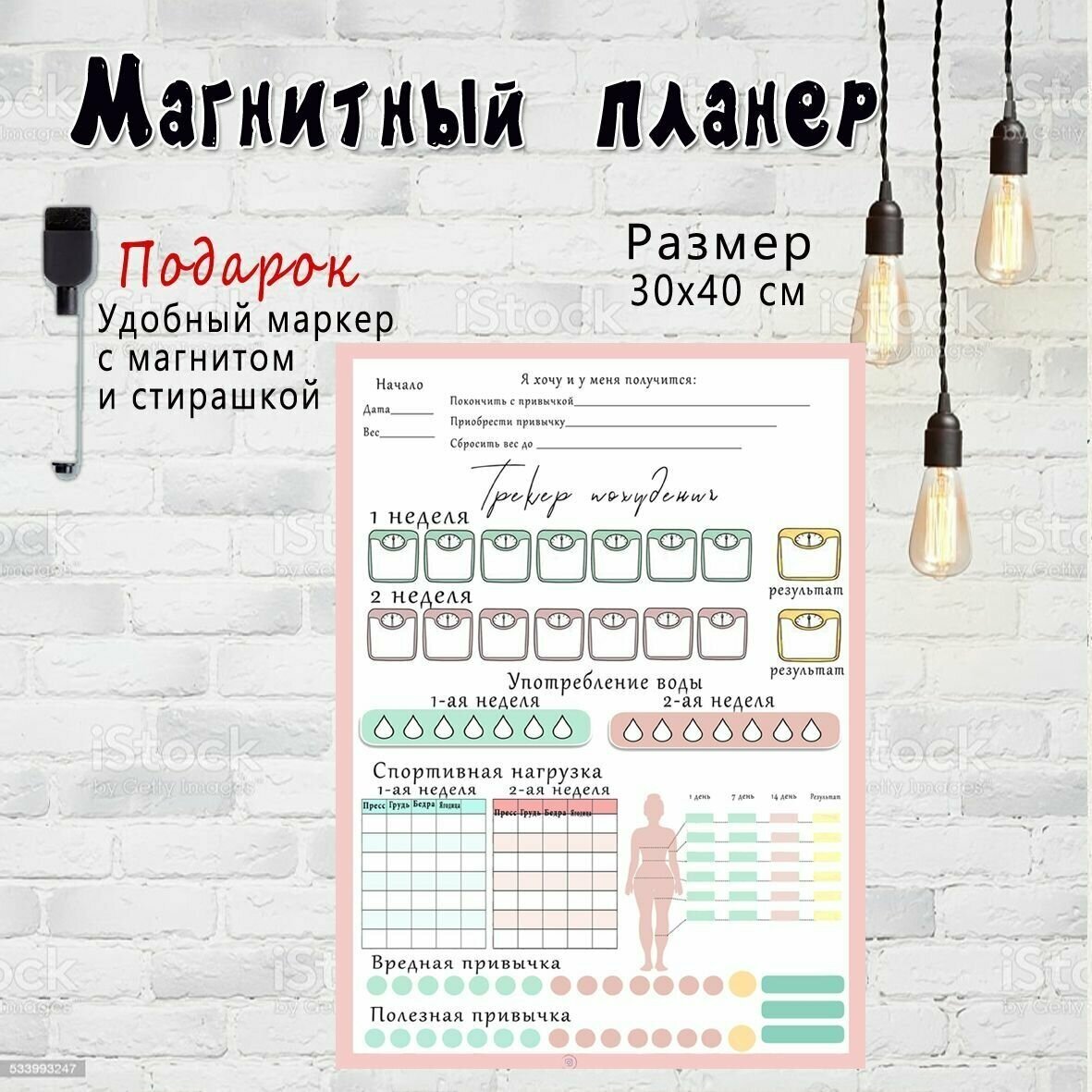 Магнитный планер А3 с маркером. /поверхность пиши - стирай /Трекер веса, привычек, употребления воды, спортивной нагрузки. информация: