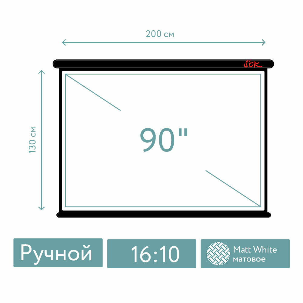 Экран для проектора SOK SCPSW-200x130BLCK 90 16:10 настенно-потолочный, ручной, матовый, черный информация: