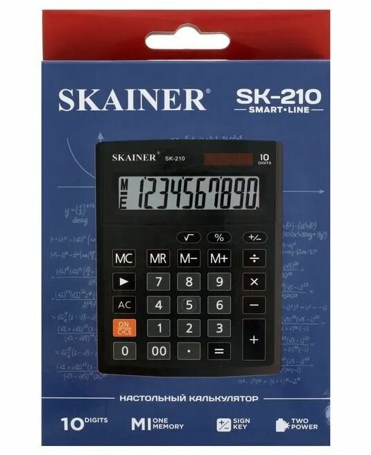 | Подробная комплектация | Калькулятор настольный Skainer 10 разрядов, 103*137*31мм, двойное питание, черный - 1 штука |