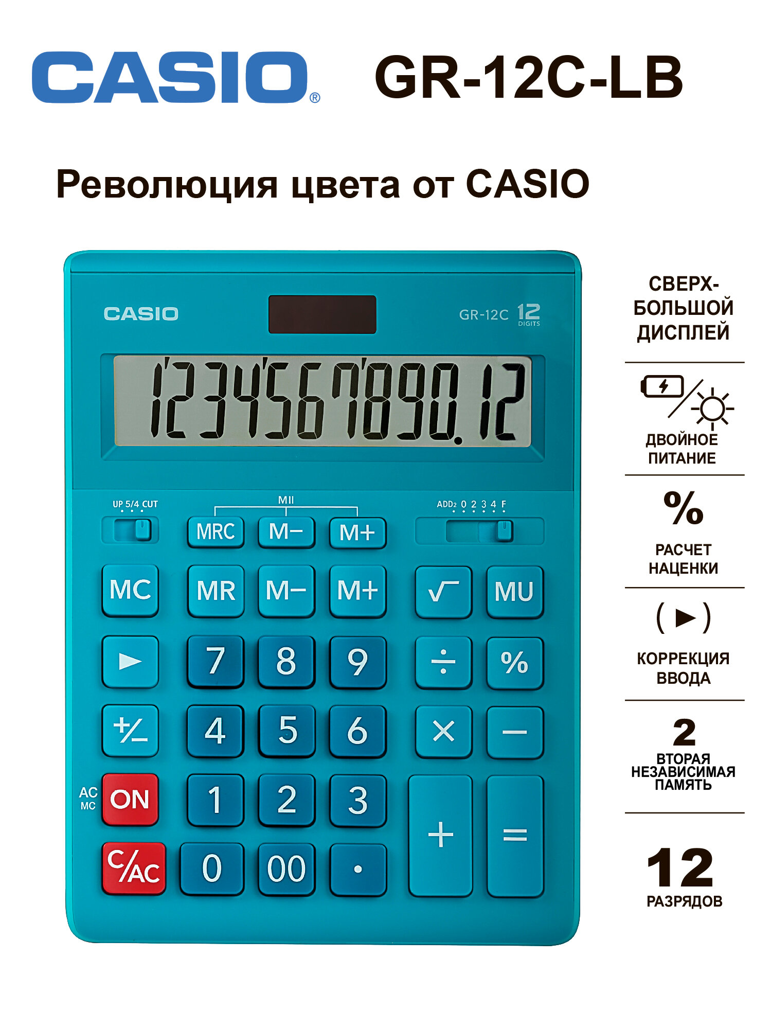 Калькулятор CASIO GR-12, голубой, 12 разрядов, бухгалтерский информация: