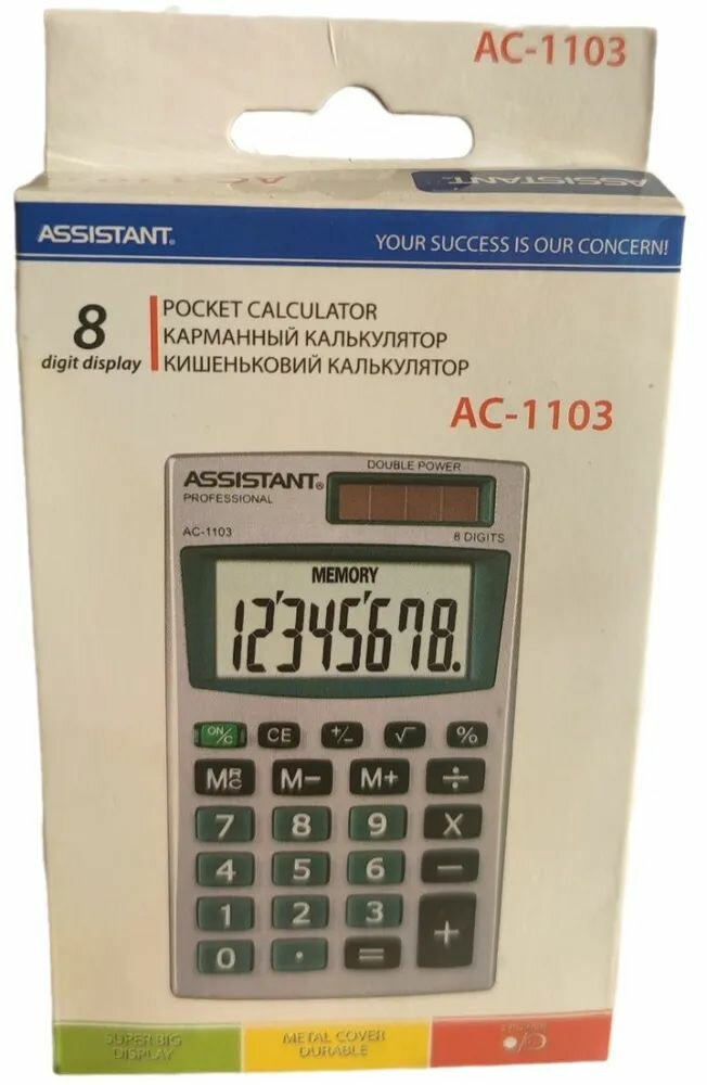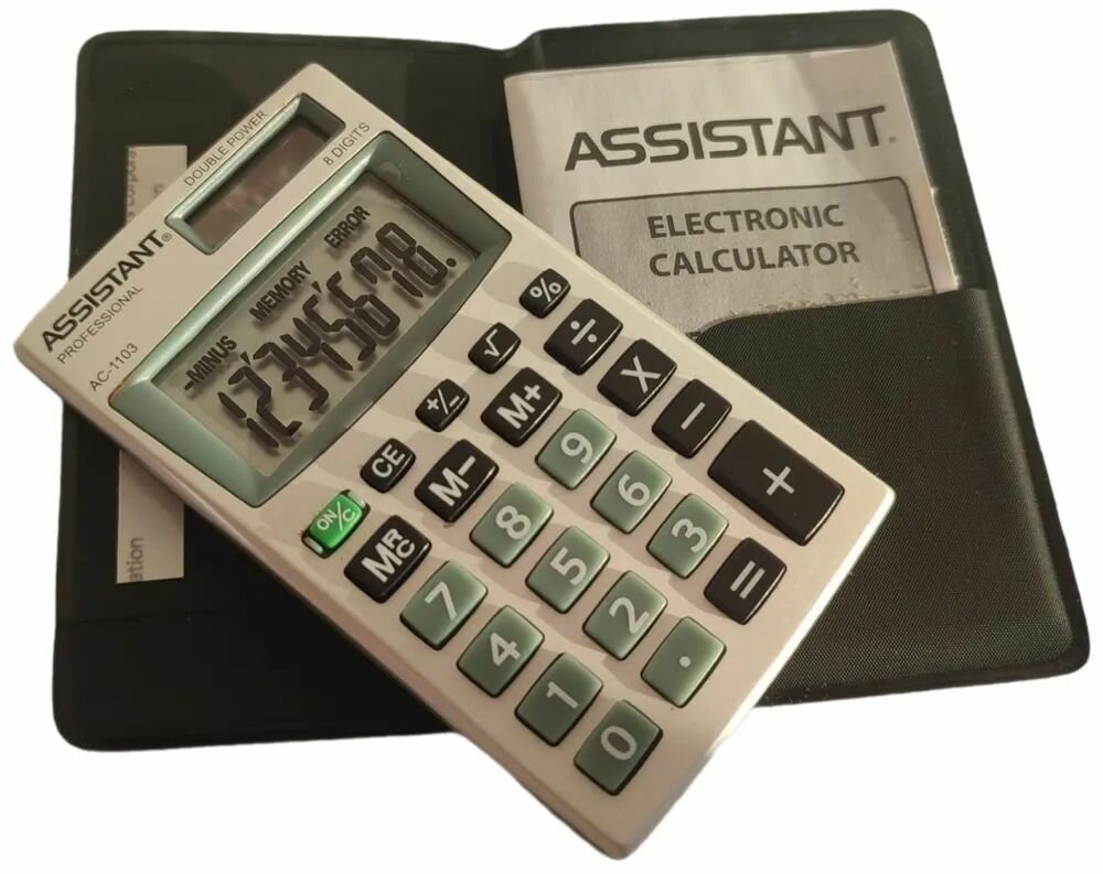Отзывы на Калькулятор карманный Assistant AC-1103, 8 разрядов, двойное питание, ПВХ обложка, металлическая панель, размер 98 х 57 х 10 мм
