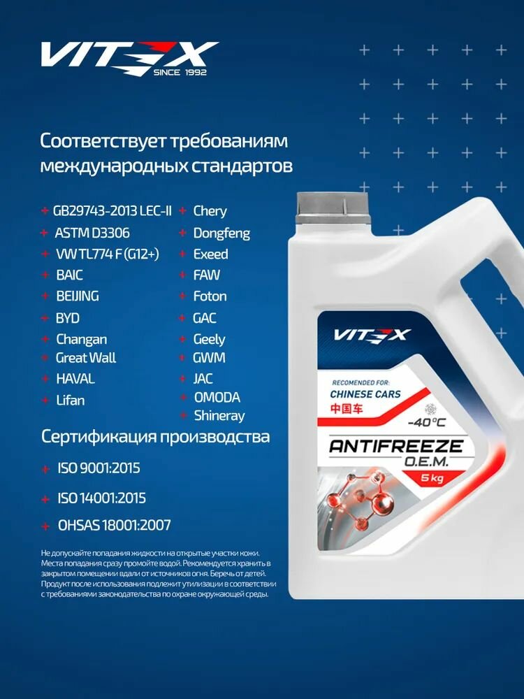 Антифриз Vitex O.E.M. для китайских автомобилей Chinese cars -40 5кг информация: