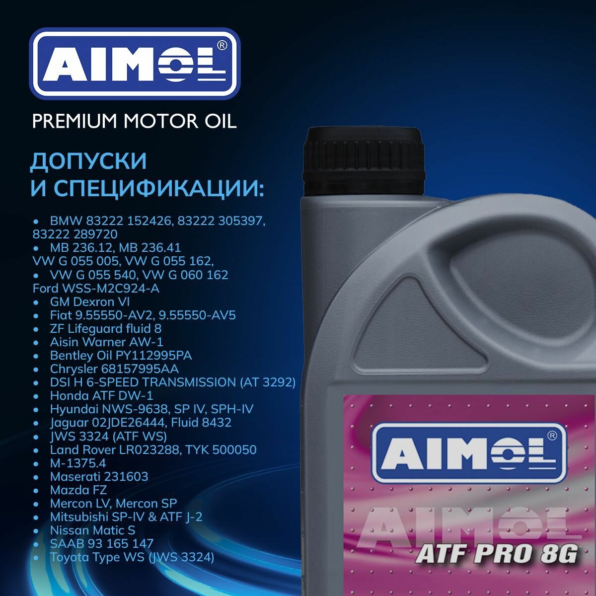 | Допуски OEM | FIAT 9.55550-AV2 / FIAT 9.55550-AV5 / Ford WSS-M2C 924-A / JWS 3324 / MB 236.12 / MB 236.41 / Mercon LV / Mercon SP / Mitsubishi SP-IV / Nissan Matic-S / VW G 060 162 / Aisin Warner AW-1 / BMW 83222152426 / BMW 83222289720 / BMW 83222305397 / Bentley Oil PY112995PA / CHRYSLER 68157995AA / DSI H 6-SPEED TRANSMISSION (AT 3292) / Dexron VI / Honda ATF DW-1 / Hyundai NWS-9638/SP IV/SPH-IV / JAGUAR 02JDE26444 / JAGUAR 02JDE26444/Fluid 8432 / LAND ROVER LR023288/TYK 500050 / M-1375.4 / Maserati 231603 / Mazda FZ / Saab 93 165 147 / Toyota Type WS (JWS 3324) / VW G 055 005/162/540 / ZF LIFEGUARDFLUID 8 |