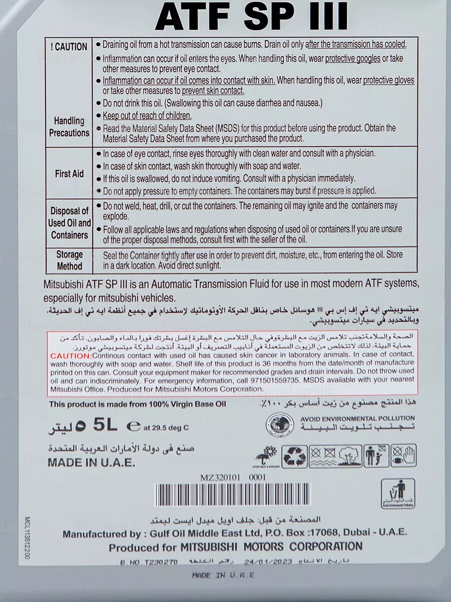 ATF SP III (Дубай) 5л, масло трансмиссионное акпп митсубиси информация: