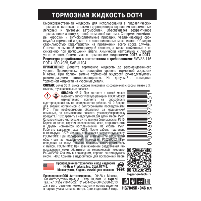 Тормозная Жидкость Dot 4 1Л Hi-Gear арт. hg7045r информация: