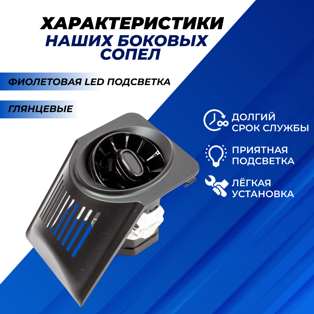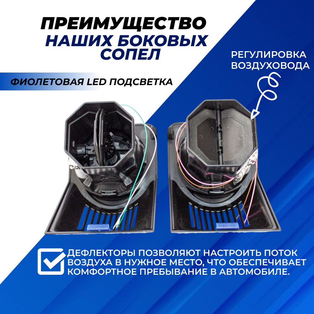 Дефлекторы 2107 печки боковые фиолетовая LED подсветка в стиле АМГ 2шт. сопла воздуховода с регулировкой глянцевые AMG для обогрева стекла на панель приборов, облицовка черный лак 6 520 ₽
