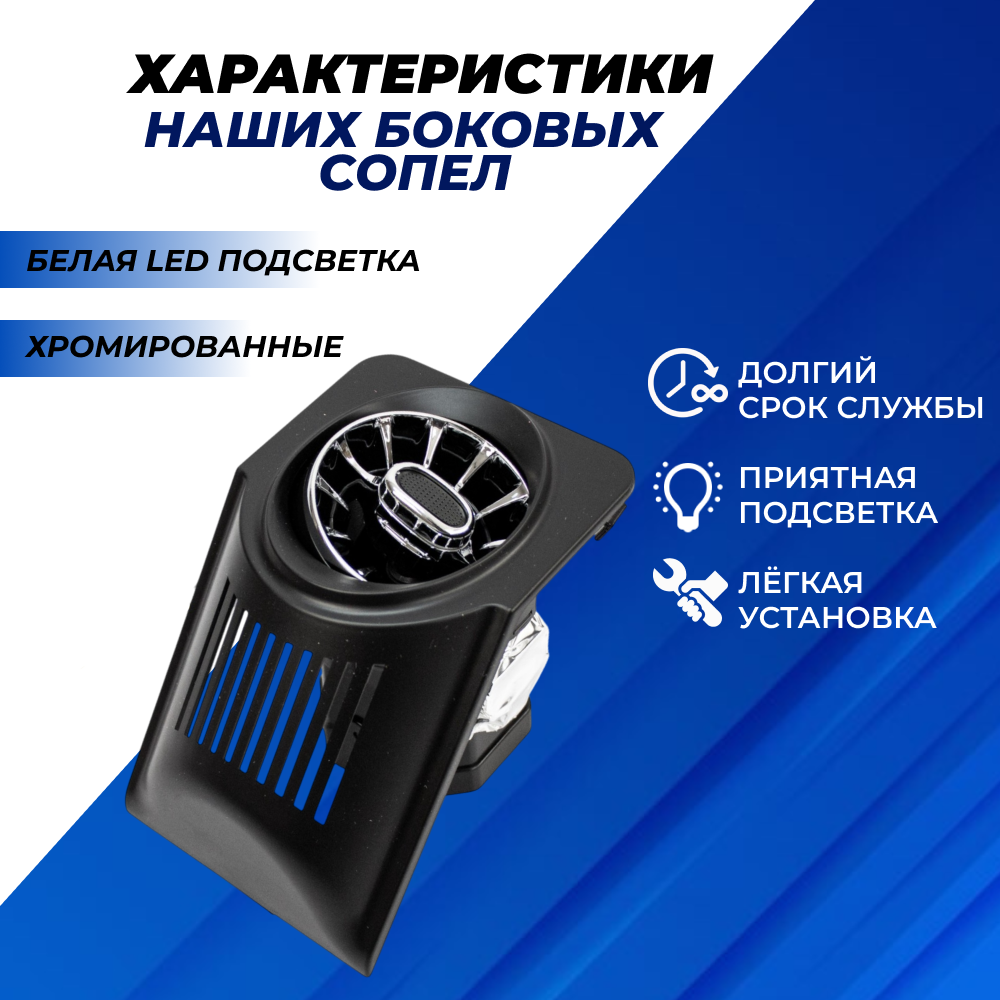 Дефлекторы 2107 печки боковые синяя LED подсветка 2шт. в стиле АМГ, сопла воздуховода с регулировкой AMG для обогрева стекла на панель приборов хромированные с облицовкой черный мат 6 520 ₽