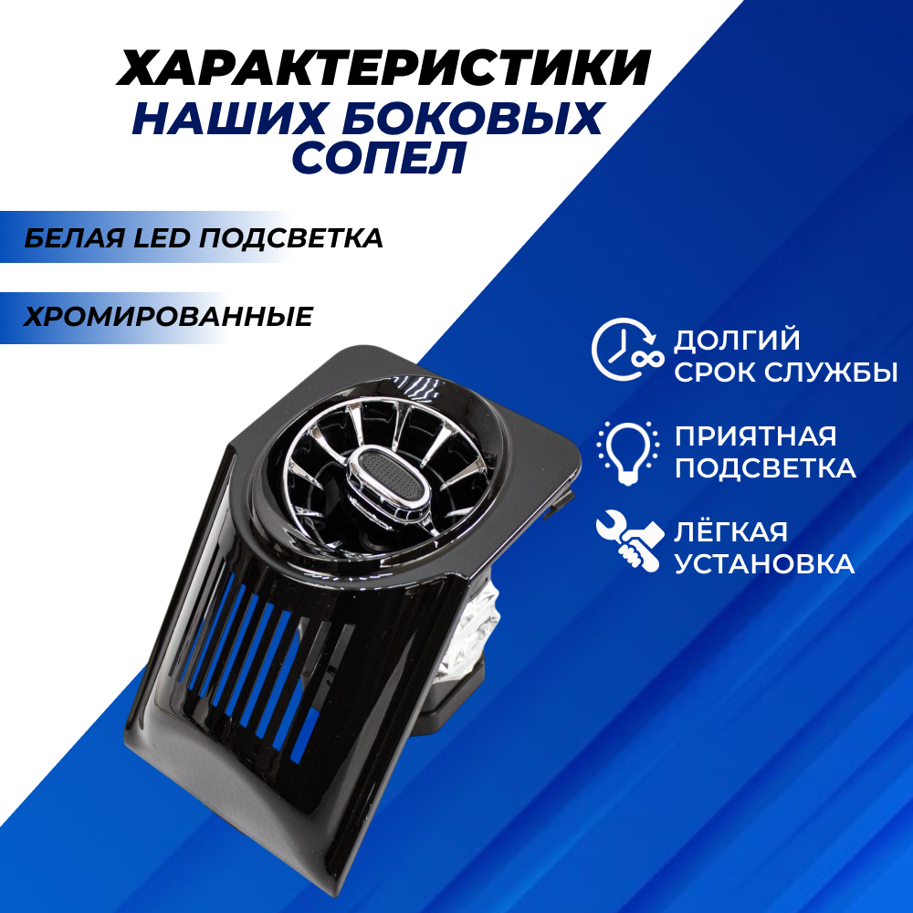 Дефлекторы 2107 печки боковые синяя LED подсветка 2шт. в стиле АМГ, сопла воздуховода с регулировкой AMG для обогрева стекла на панель приборов хромированные с облицовкой черный мат 6 520 ₽