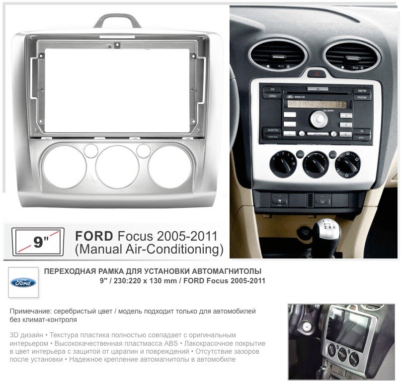 Переходная рамка Ford Focus 2 без климат-контроля, 9", серебристая информация: