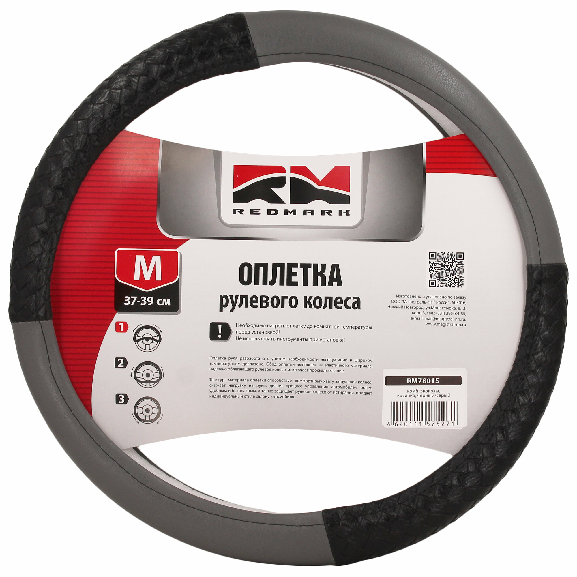 Оплетка руля RedMark, комбинированная, экокожа, М размер, косичка черный/серый информация: