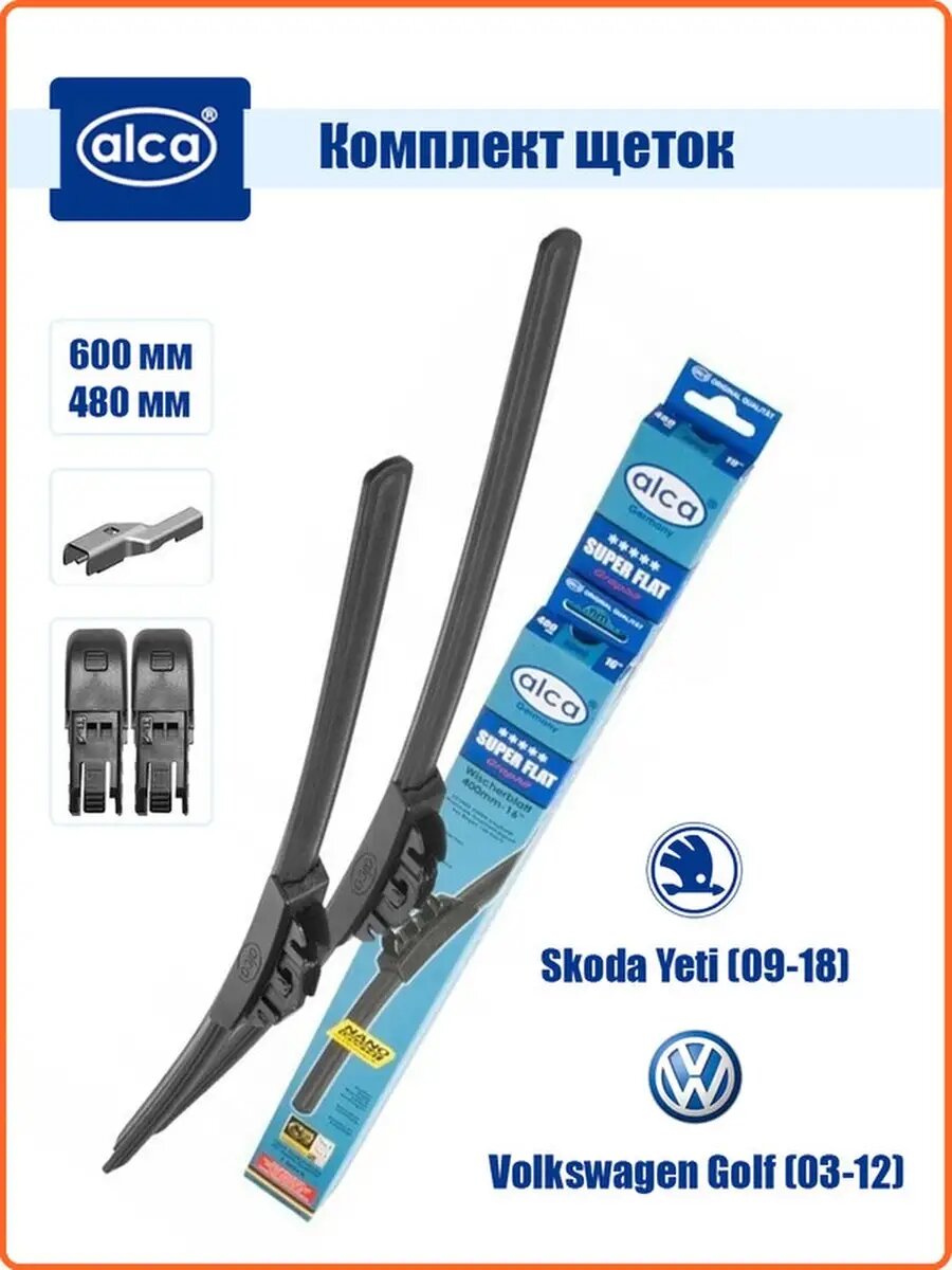 Комплект дворников ALCA Super Flat 600мм/480мм: Skoda Yeti (09-18), Volkswagen Golf (03-12) информация: