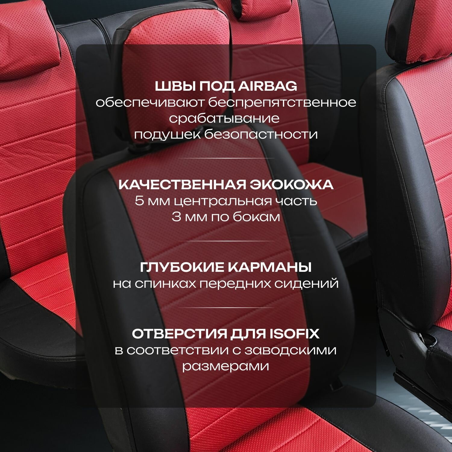 | Особенности | износоустойчивая ткань / Использование с боковыми airbag / Карманы в спинках передних сидений / Крепеж / Петли для крепления / Стягивающая резинка по периметру / Фиксирующие резинки |