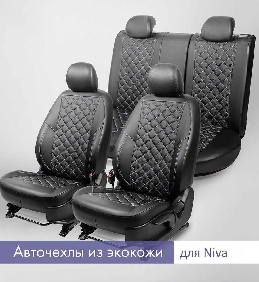 Комплект чехлов для Chevrolet Niva с 16г. / LADA Niva Travel с 20г. Экокожа, ромб, черный, белая строчка.