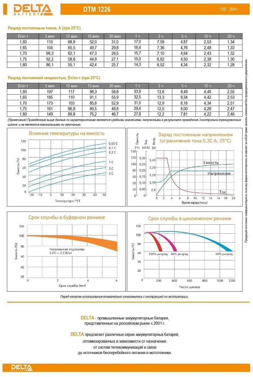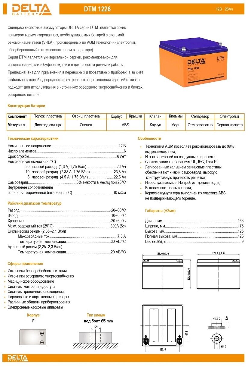 Аккумуляторная батарея Delta DTM 1226 12В 26Ач AGM для ИБП, UPS, аккумулятор для детского электромобиля информация: