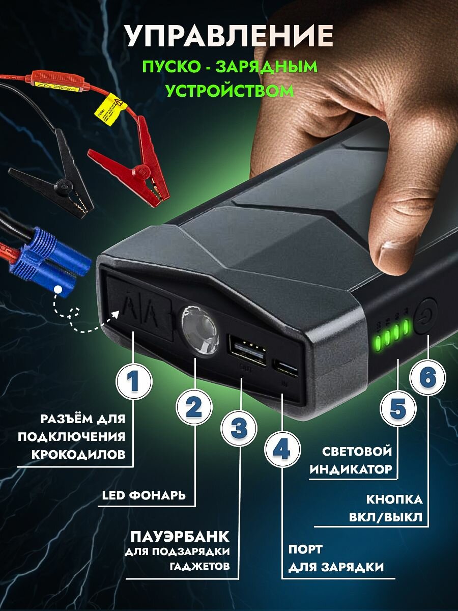 | Комплектация | пусковое зарядное устройство; провода-"крокодилы"; кабель-переходник для зарядки мобильных устройств Type-C; сумка-чехол |