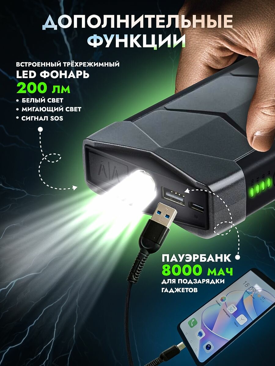 Пусковое устройство для авто, LED фонарь, черный матовый, 800 А, 18 см