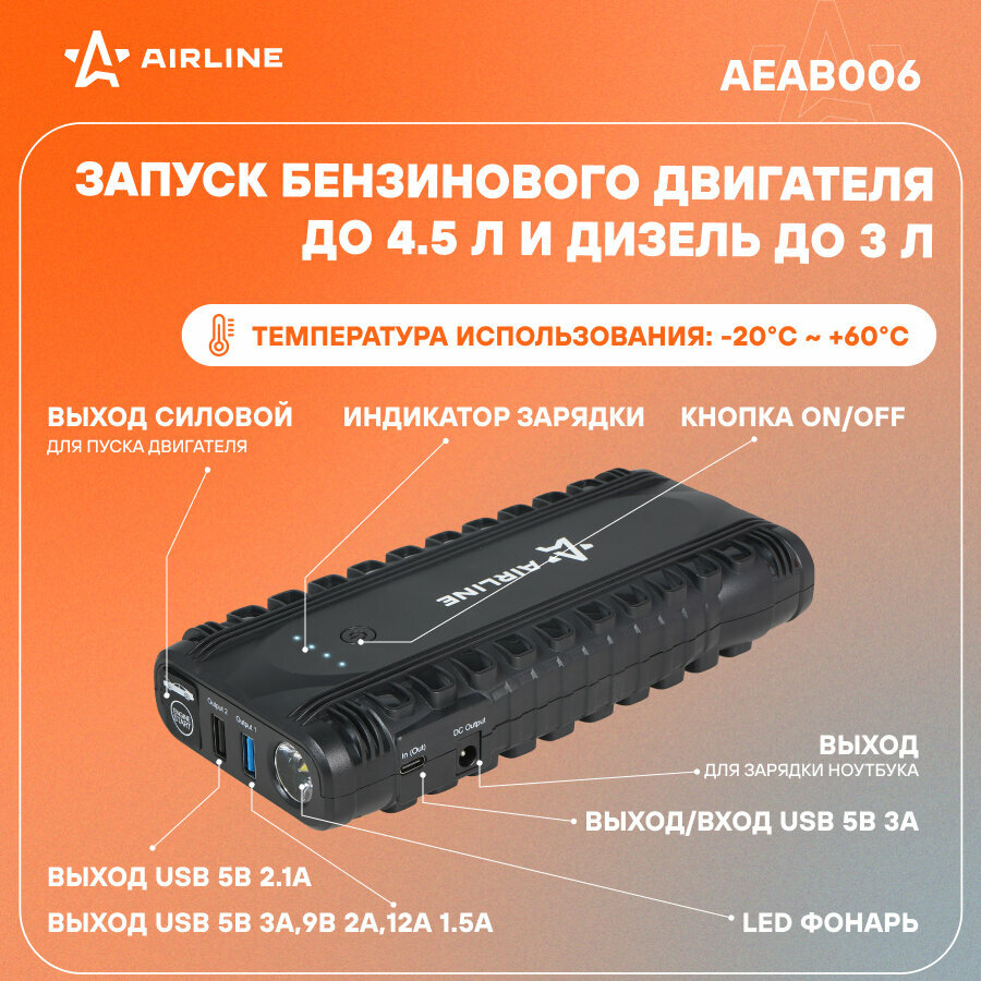 Аккумулятор пусковой (Booster) 12000мАч, 750А, 14.8V, умные провода, пуск ДВС 3.0d, кейс AEAB006 AIRLINE информация: