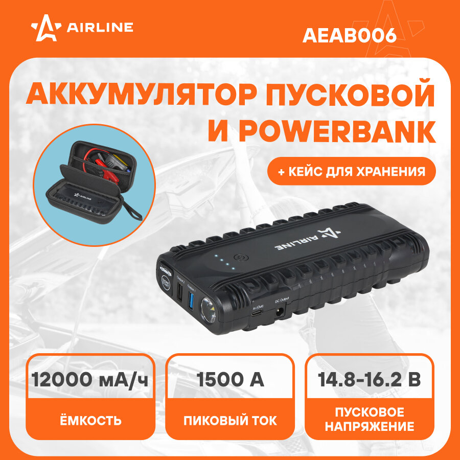 Аккумулятор пусковой (Booster) 12000мАч, 750А, 14.8V, умные провода, пуск ДВС 3.0d, кейс AEAB006 AIRLINE