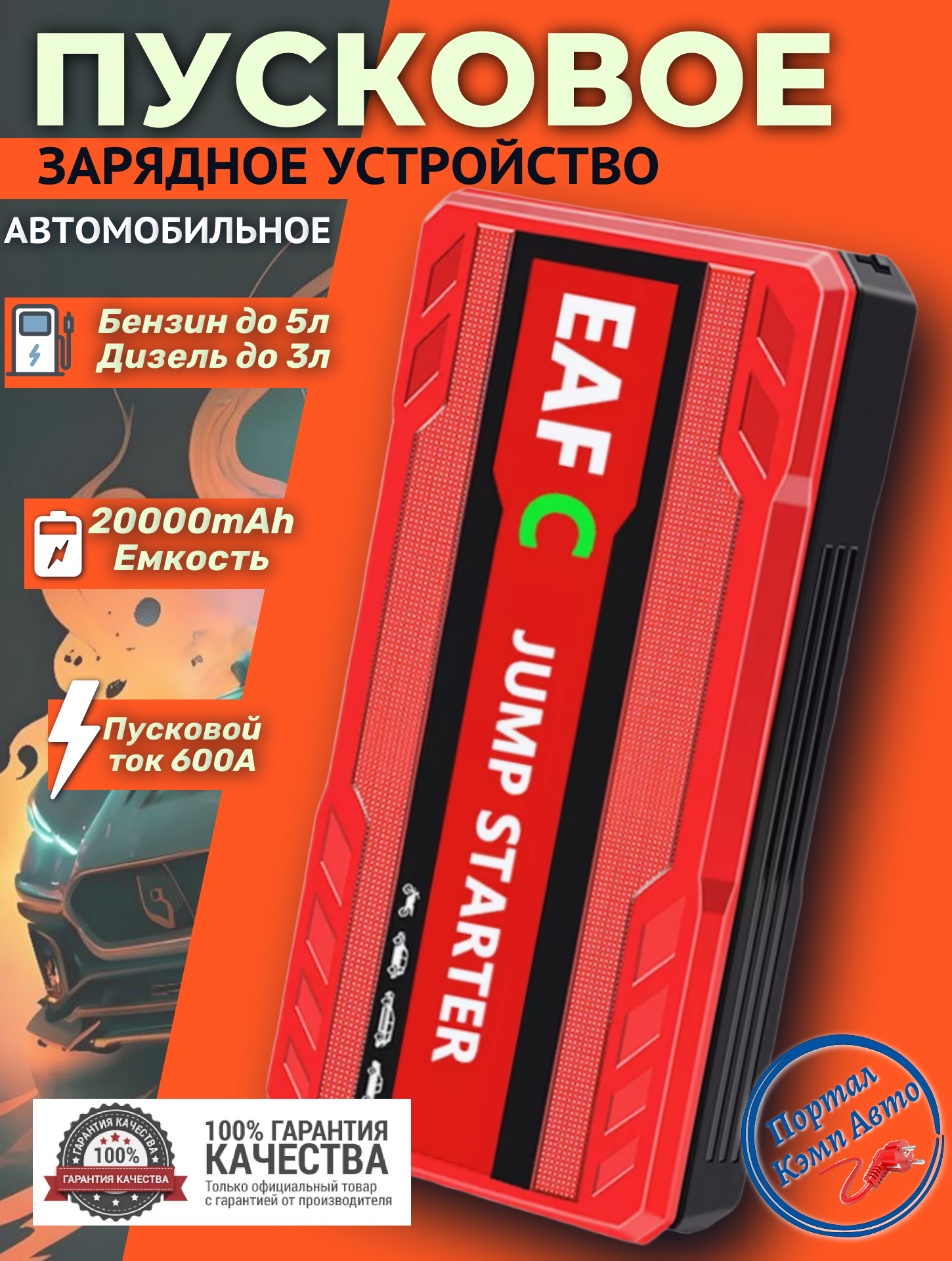 Автомобильное пусковое портативное устройство бустер EAFC 20000mAh 600A информация: