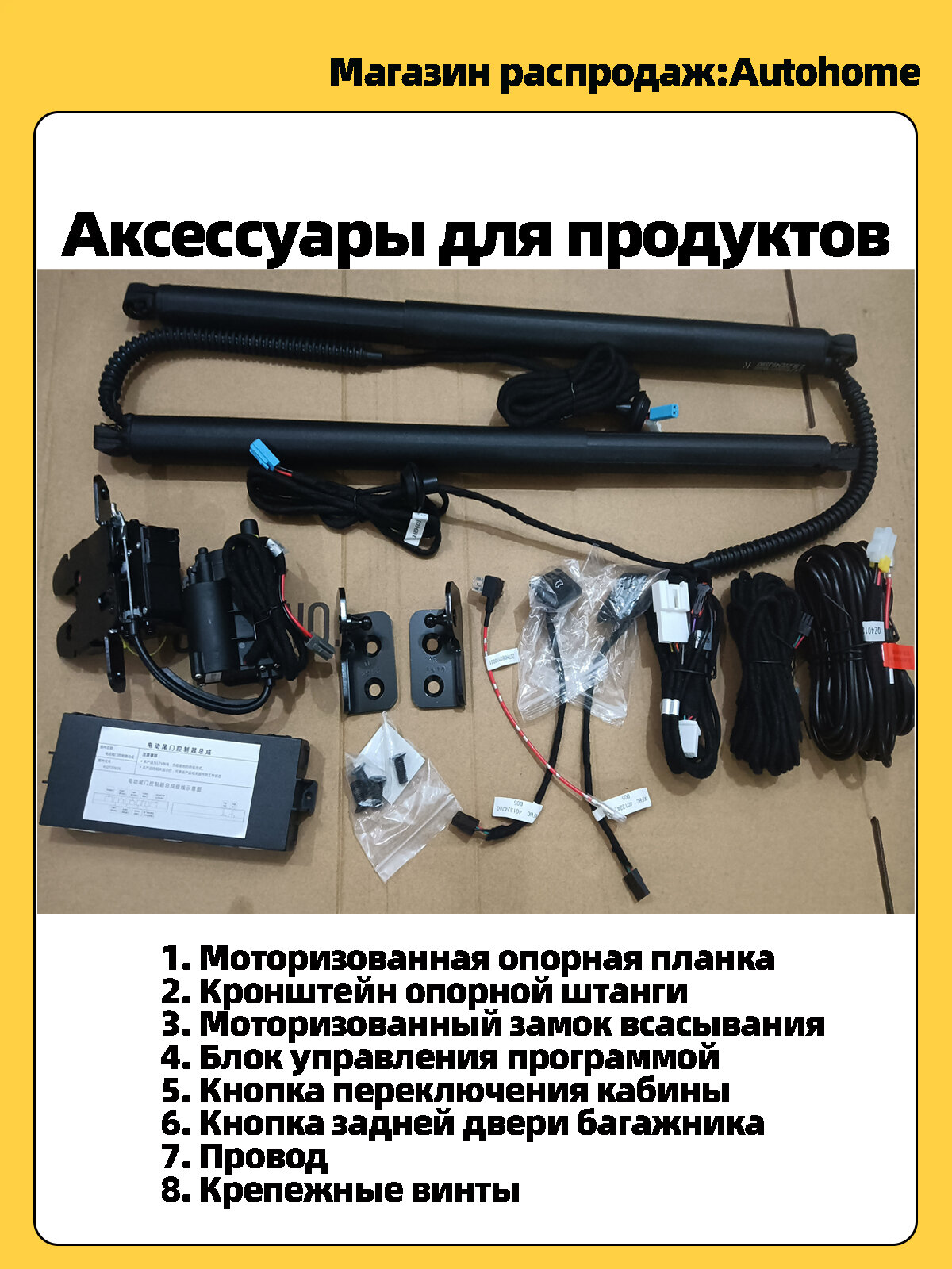 | Подробная комплектация | 1. Электропривода крышки багажника. 2. Электронный блок управления. 3. Кнопка управления закрытием крышки багажника. 4. Кнопка салона для управления открытием/закрытием багажника. 5. Комплект проводов для подключения электропривода. 6.Датчик ноги Foot Sensor для электропривода 7. Дотяжка 8. Инструкция по установке P007 S159 K723 |