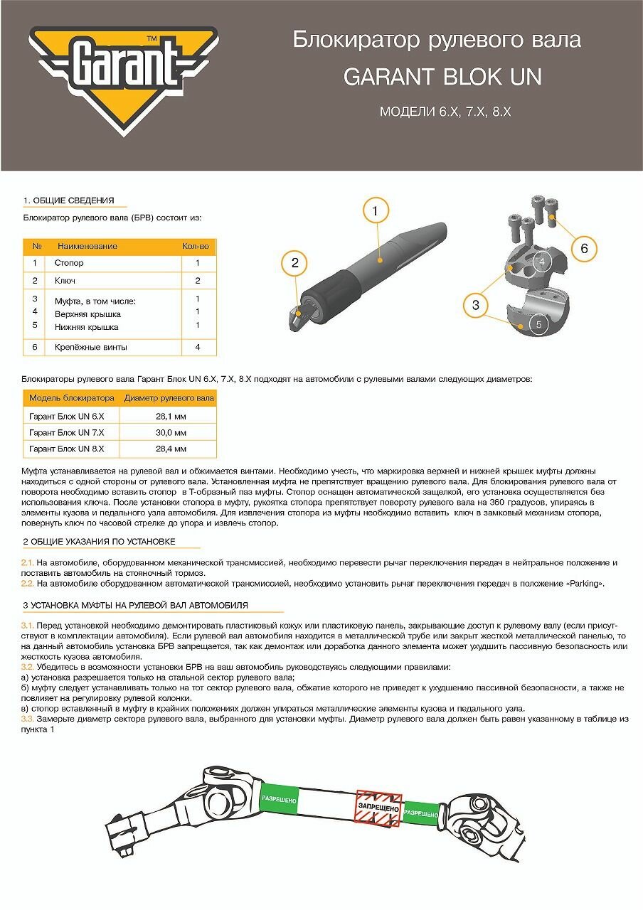 Блокиратор рулевого вала Гарант Блок UN.6. X Универсальное противоугонное устройство для авто с диаметром рулевого вала ф28,1мм информация: