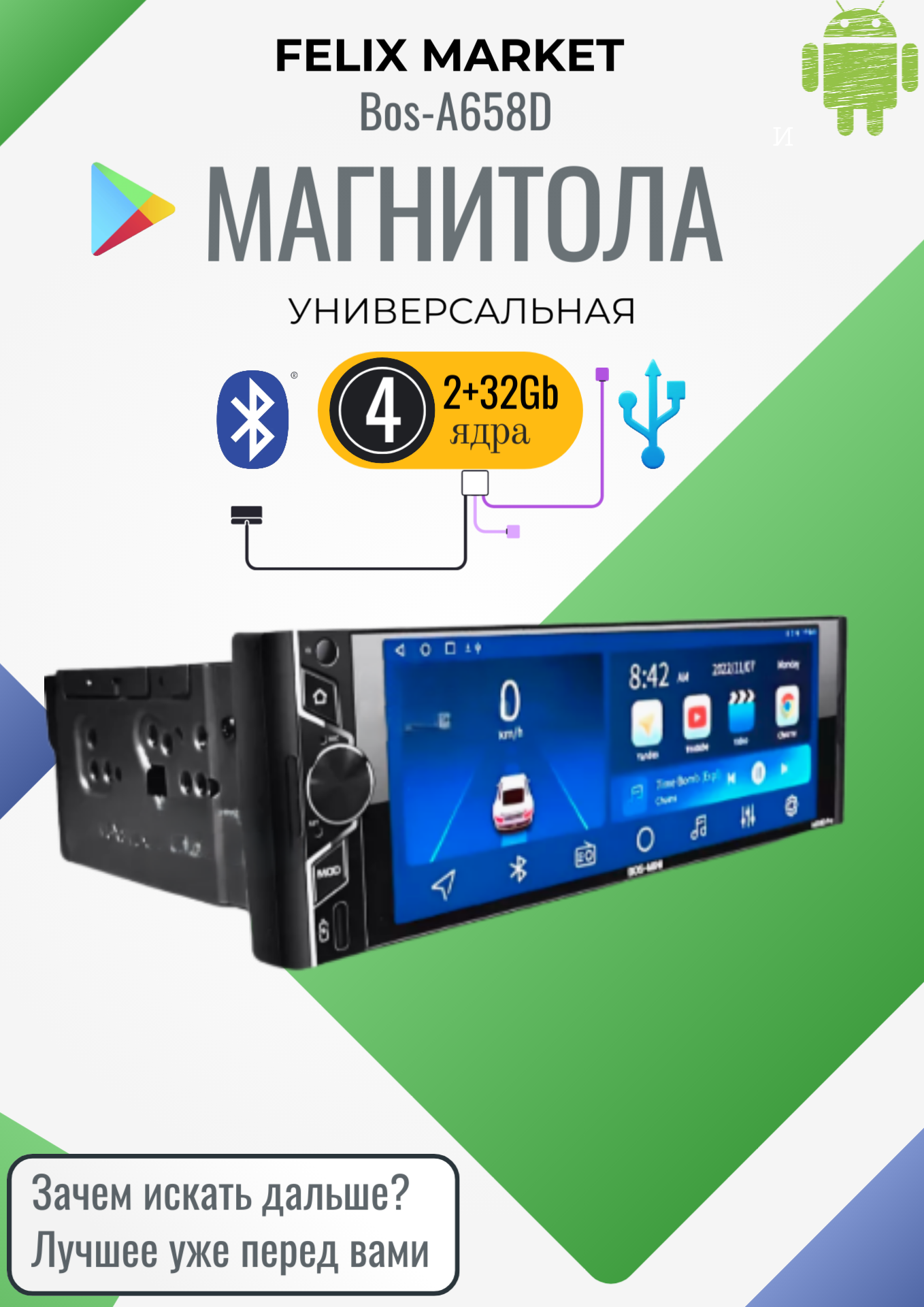 Автомагнитола 1din , BOS-А659D PRO 2+32G c навигатором и блютус (CarPlay, GPS, Wi-Fi, Bluetooth) информация: