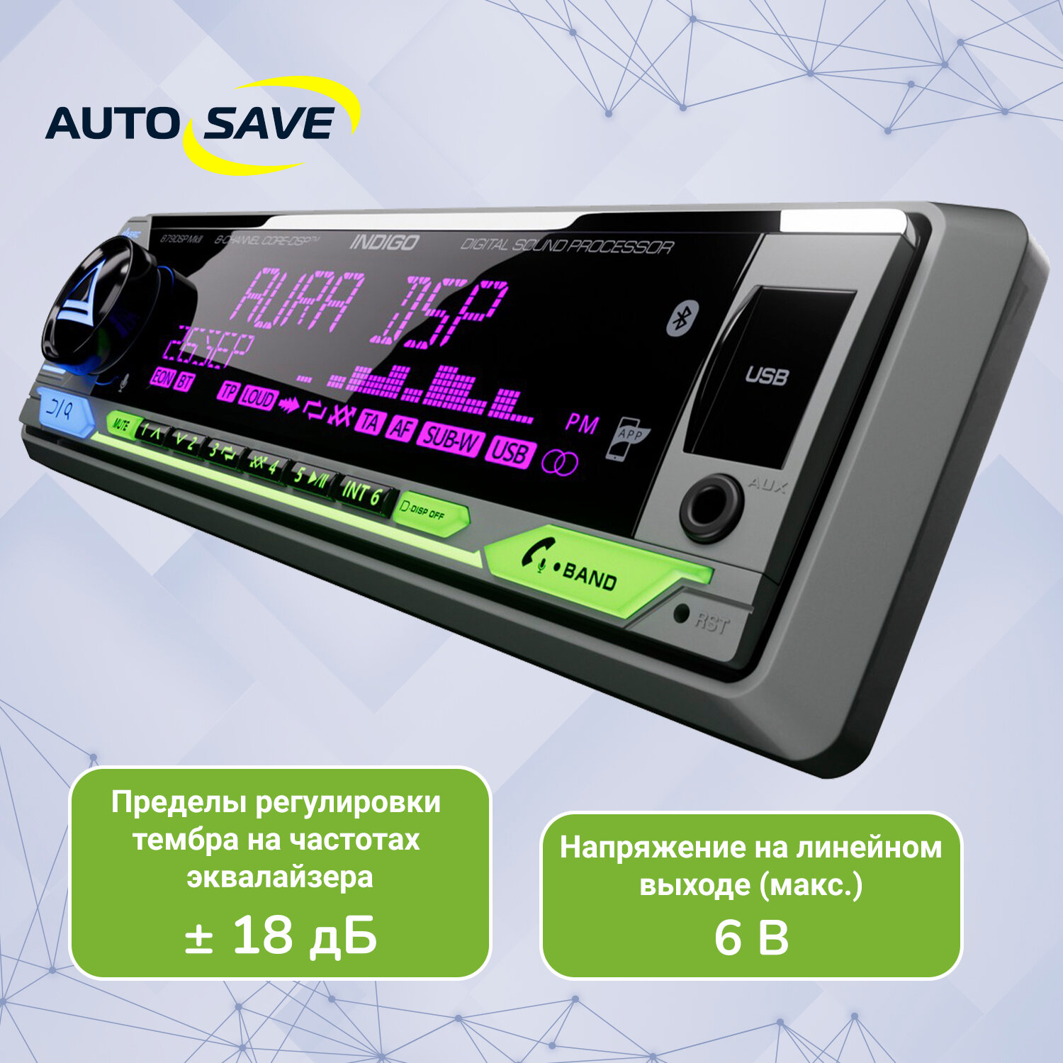 Автомагнитола Aura INDIGO-876DSP MkII BT/USB/FM процессорная магнитола в машину 1DIN