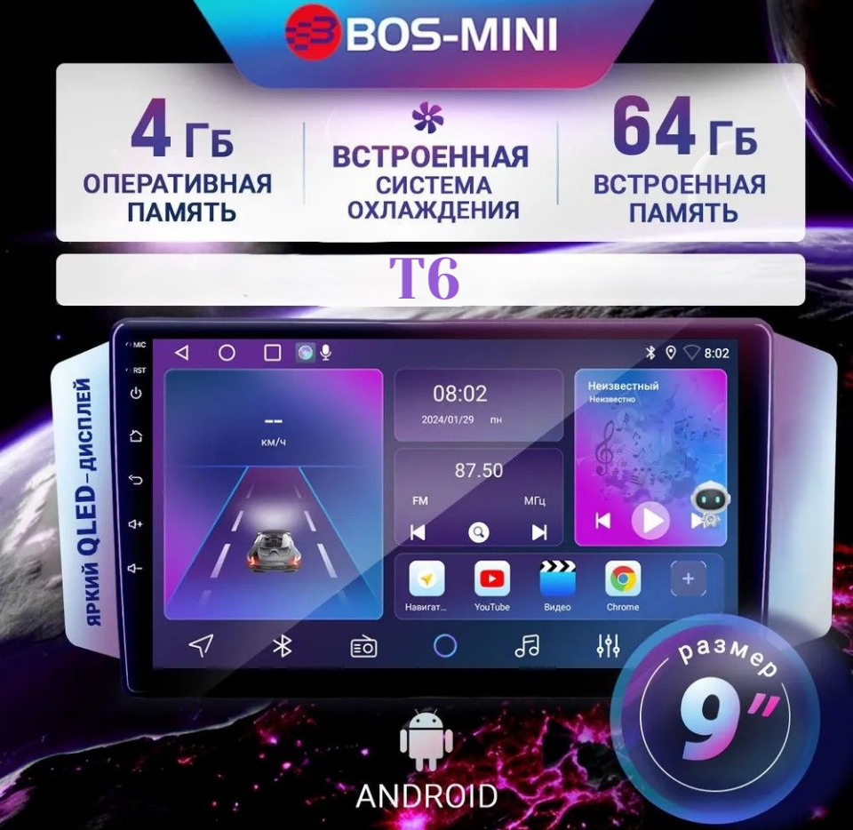 Магнитола Bos Mini CC2, Android, 9 дюймов", 2 din, GPS, Bluetooth, Wi-Fi, Голосовое управление.4 ядра, память 2+64