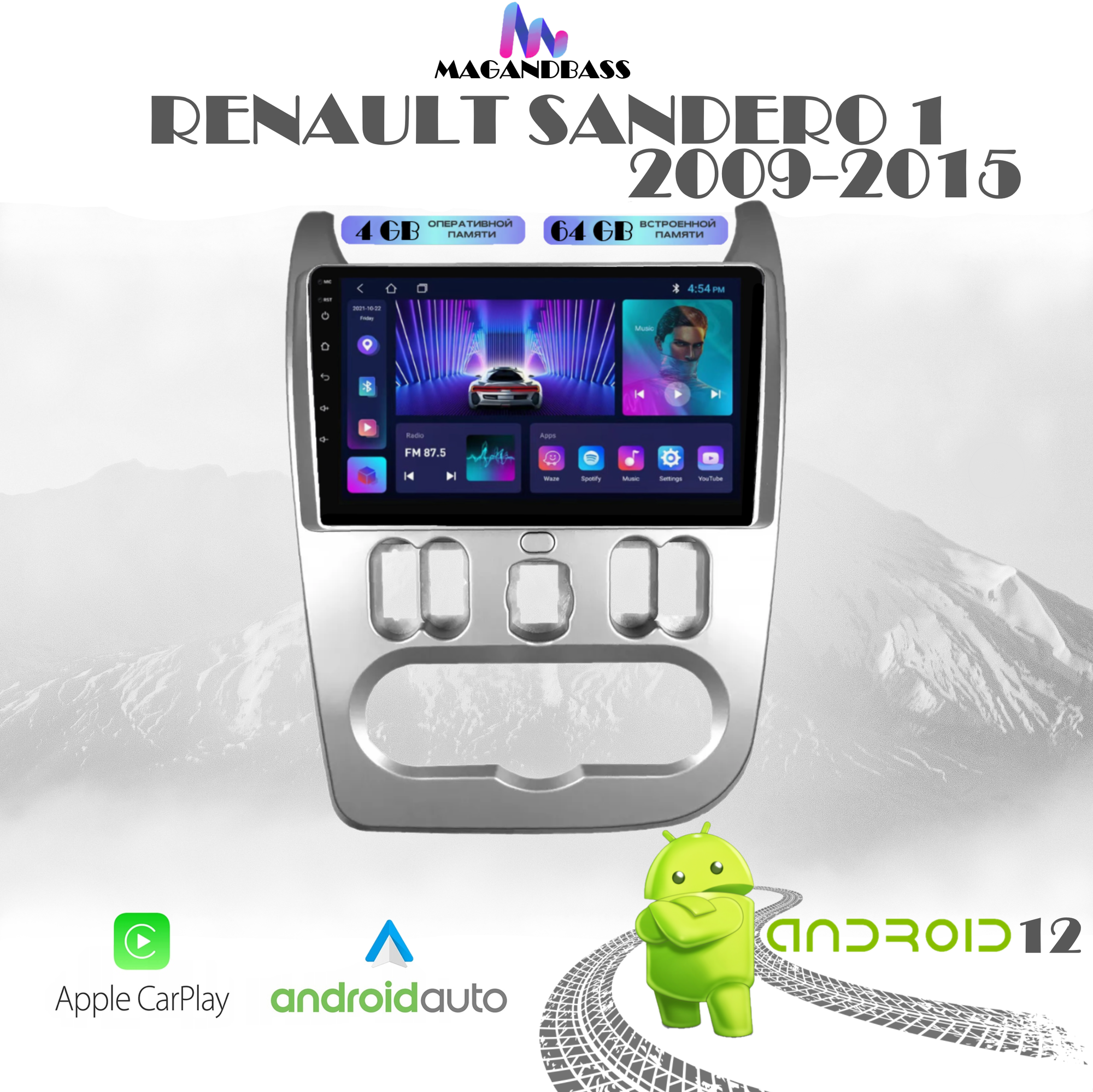 Автомагнитола для Renault Sandero 1 (2009-2015), Android 12, 4/64 GB, CarPlay, Android Auto, Bluetooth, WiFi, DSP, сенсорные кнопки, поддержка кнопок на руле информация: