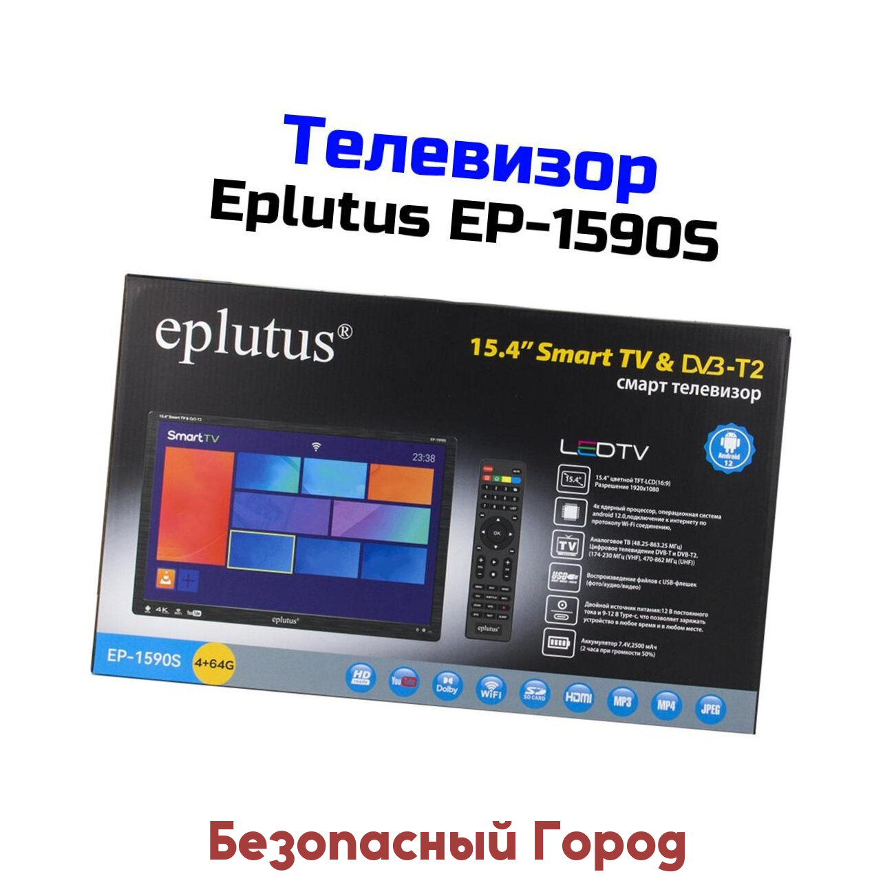 Отзывы на Портативный смарт телевизор Smart TV Эплутус Мод: EP-S.1590 (F88398OP), черный. VGA, HDMI, USB. Экран: 15.4" цветной TFT ЖК. Разрешение экрана