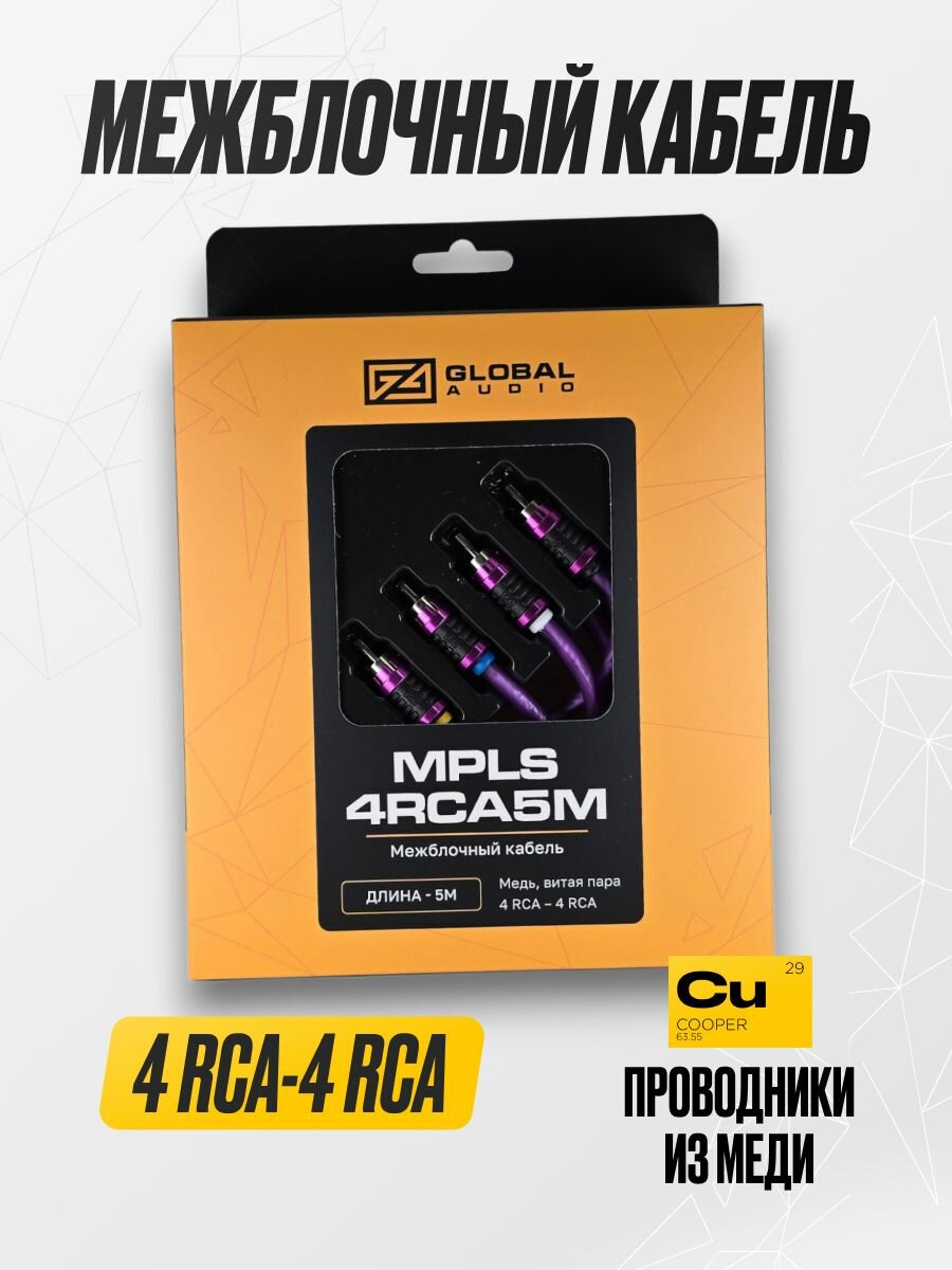 Межблочный кабель 4RCA 5м для авто, Global Audio MPLS-4RCA5M провода тюльпаны для подключения сабвуфера и усилителя информация: