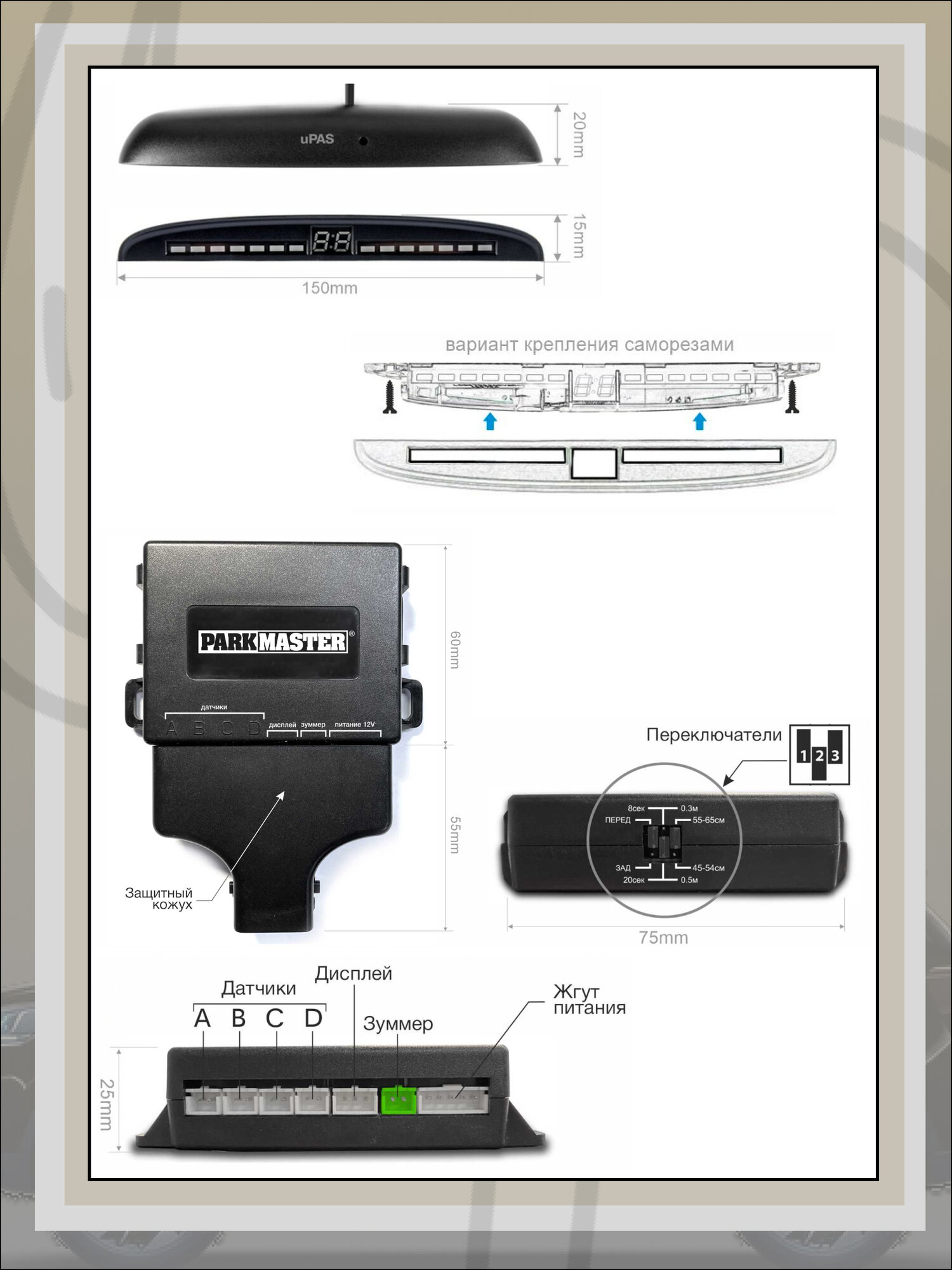 | Особенности | активация задней передачей / встроенный динамик / запоминание выносных элементов автомобиля / окрашиваемые датчики / самодиагностика датчиков / управление громкостью |