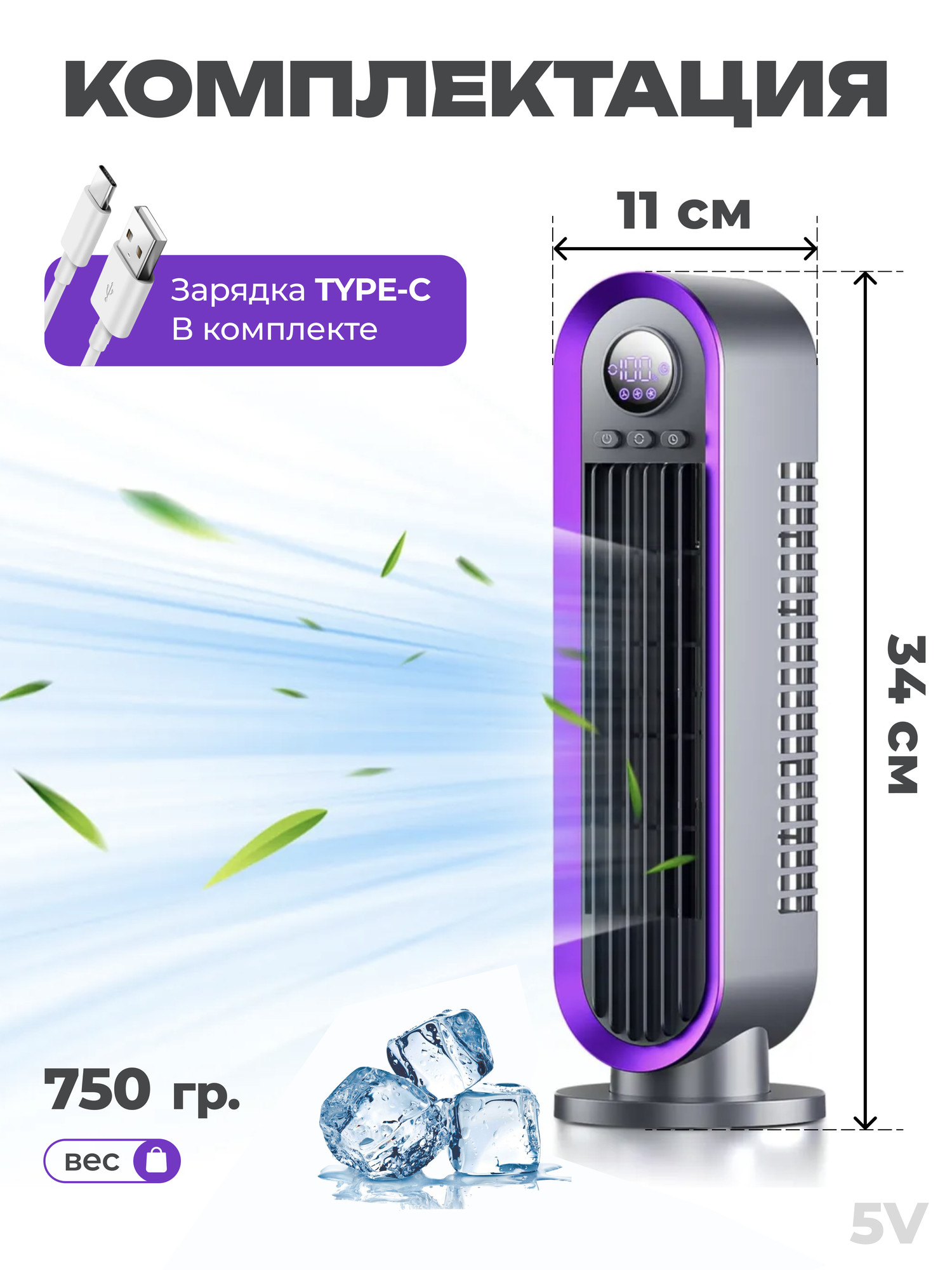 Портативный вентилятор, безлопастной, 10Вт, площадь 50м², тихий, дисплей, серый, фиолетовый информация: