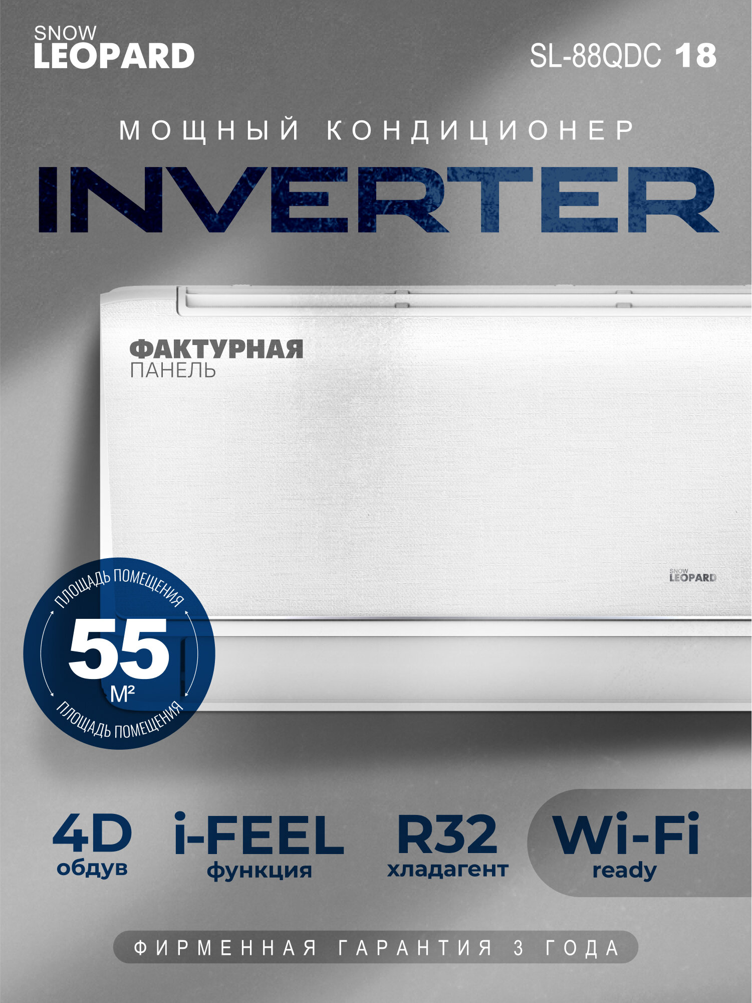 Сплит-система Snow Leopard SL-88QDC18: 55м2/ Инвертор/ Сверхэффективный A++/ Фактурная панель/ 4D обдув/ I-FEEL/ SANYO информация: