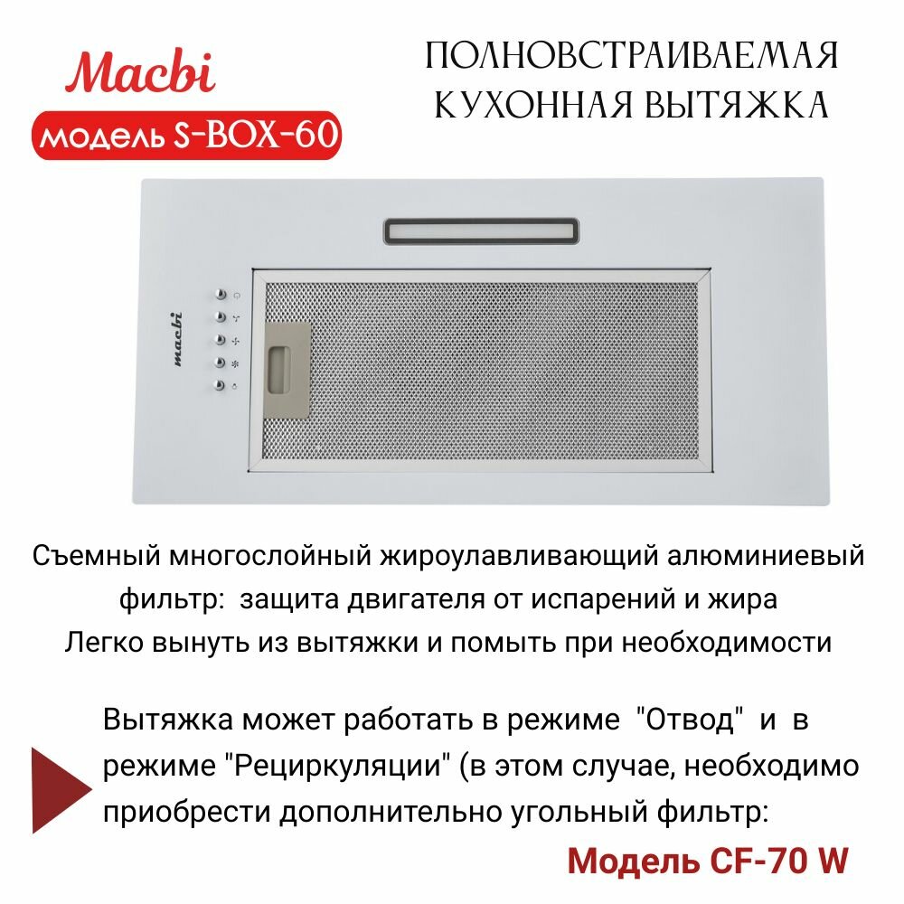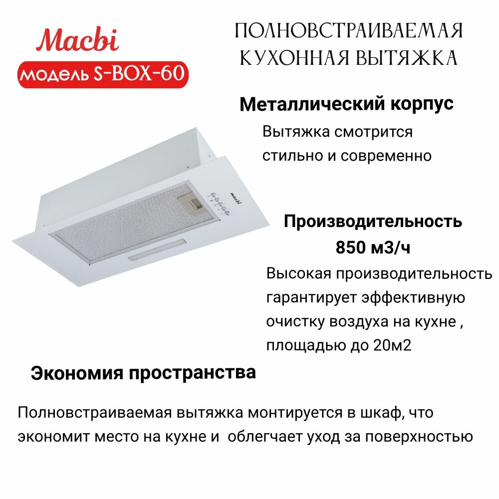 Вытяжка кухонная MACBI полновстраиваемая 60см S-BOX-60 WHITE 850 м3/ч Белая информация:
