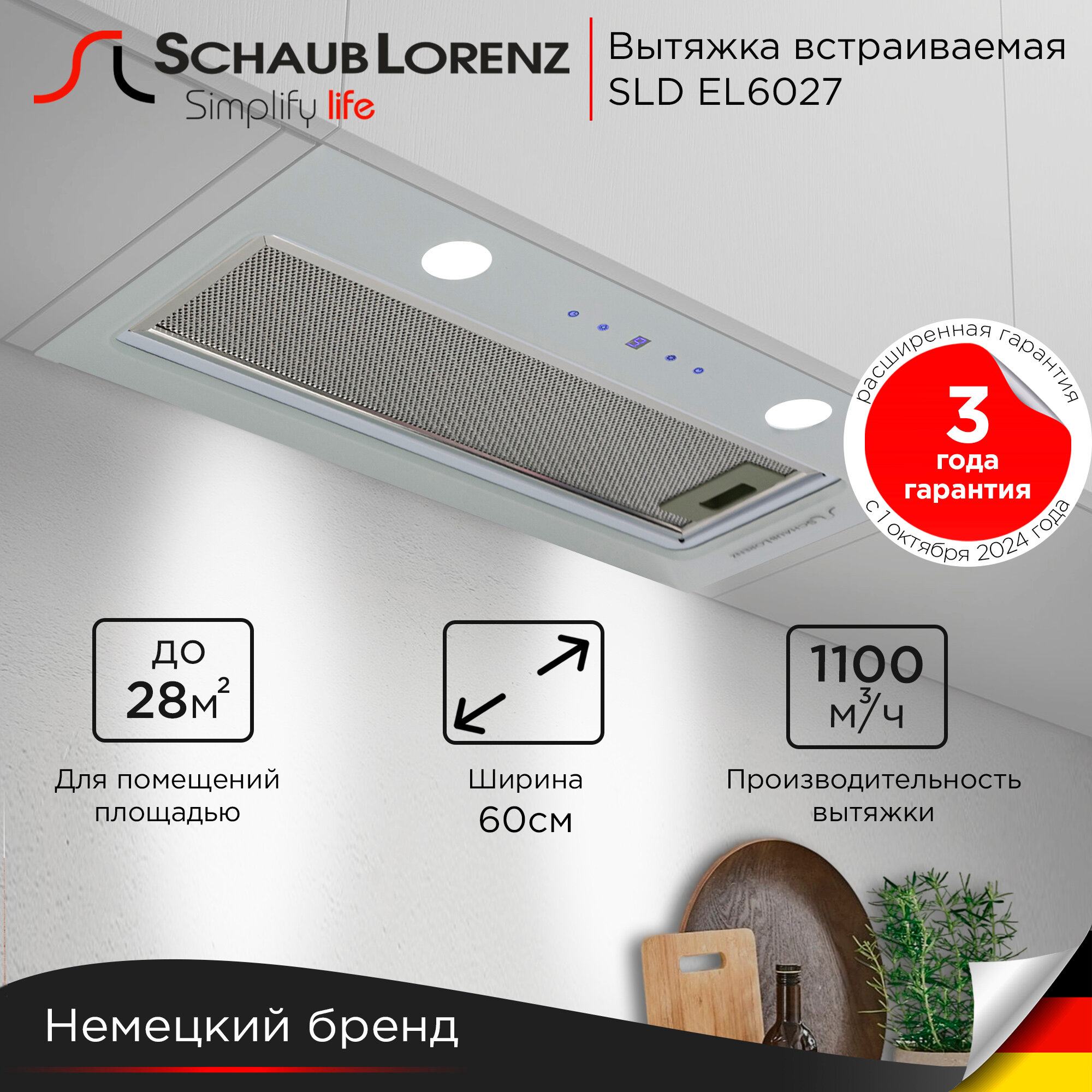 Вытяжка кухонная встраиваемая Schaub Lorenz SLD EL6027, корпус из стекла, мощность 1100 м3/ч информация: