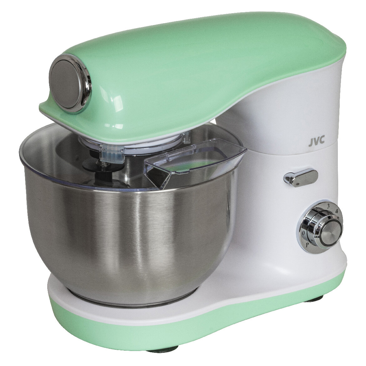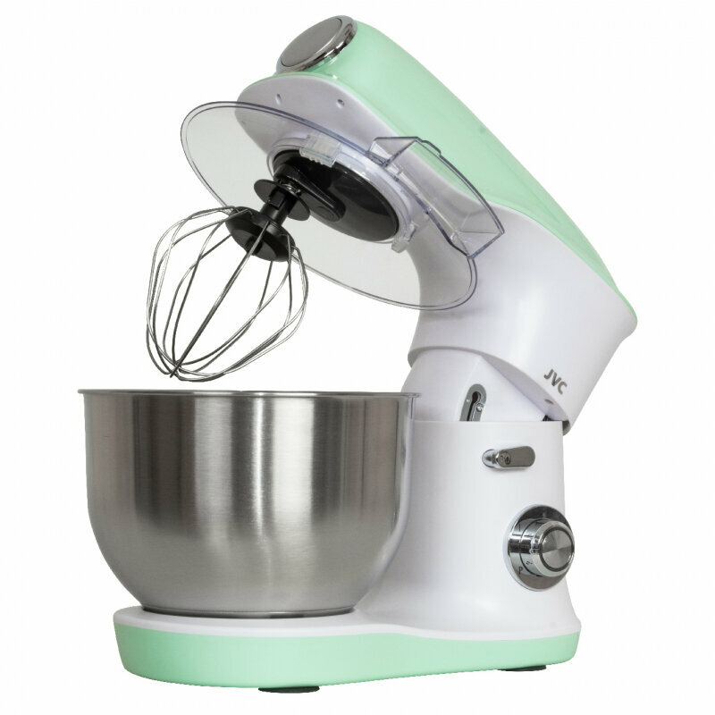 Миксер стационарный JVC со стальной чашей 5 литров, 6 скоростей, импульсный режим, 3 насадки, защитная крышка, 1000 Вт
