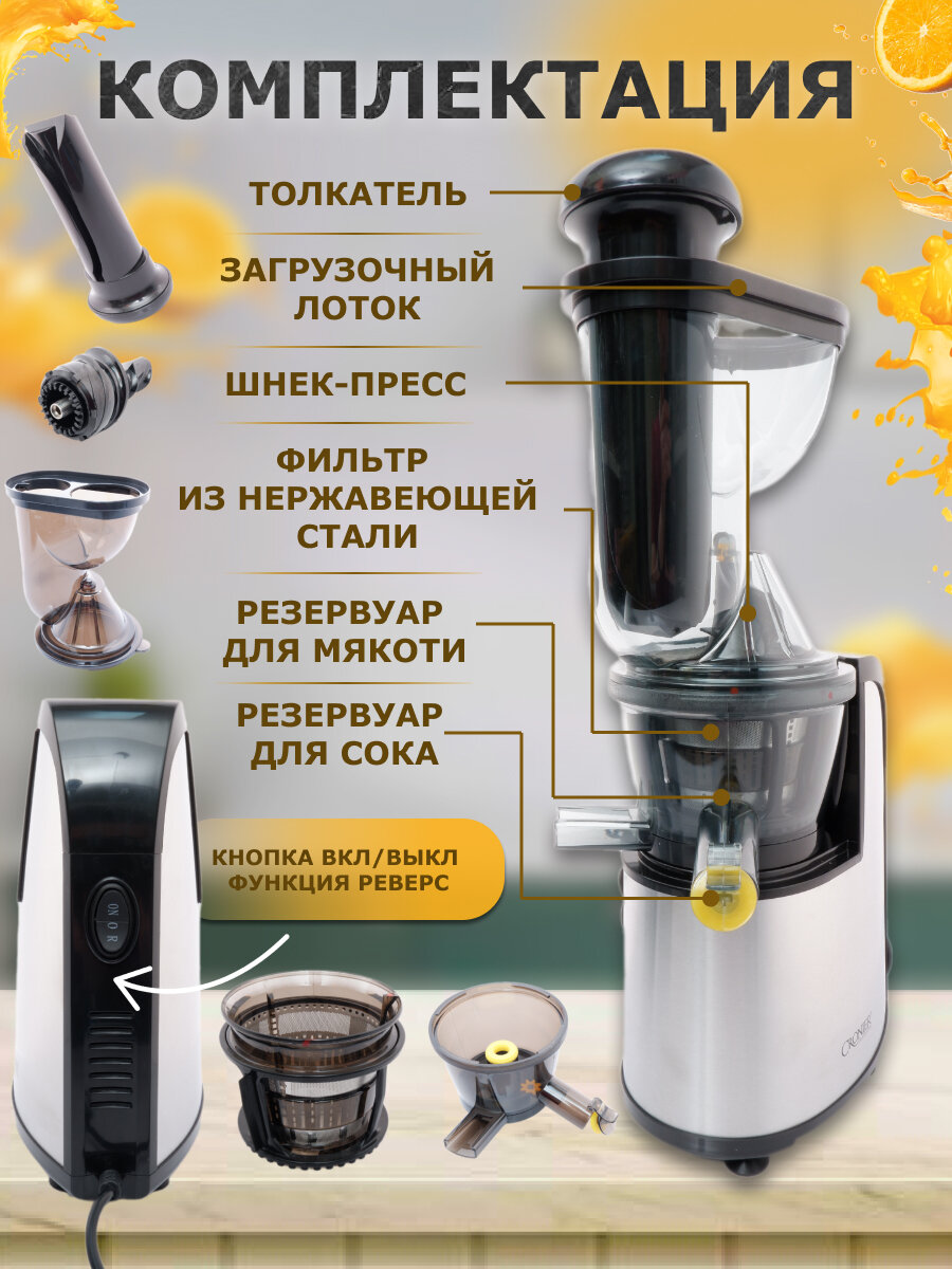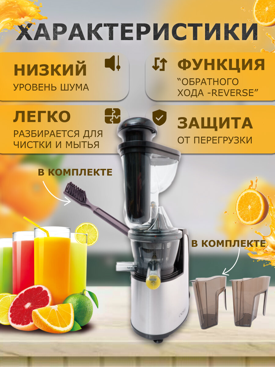 Соковыжималка шнековая, защита двигателя от перегрузки, широкое отверстие для фруктов , 350вт, антикапельная система, реверс информация: