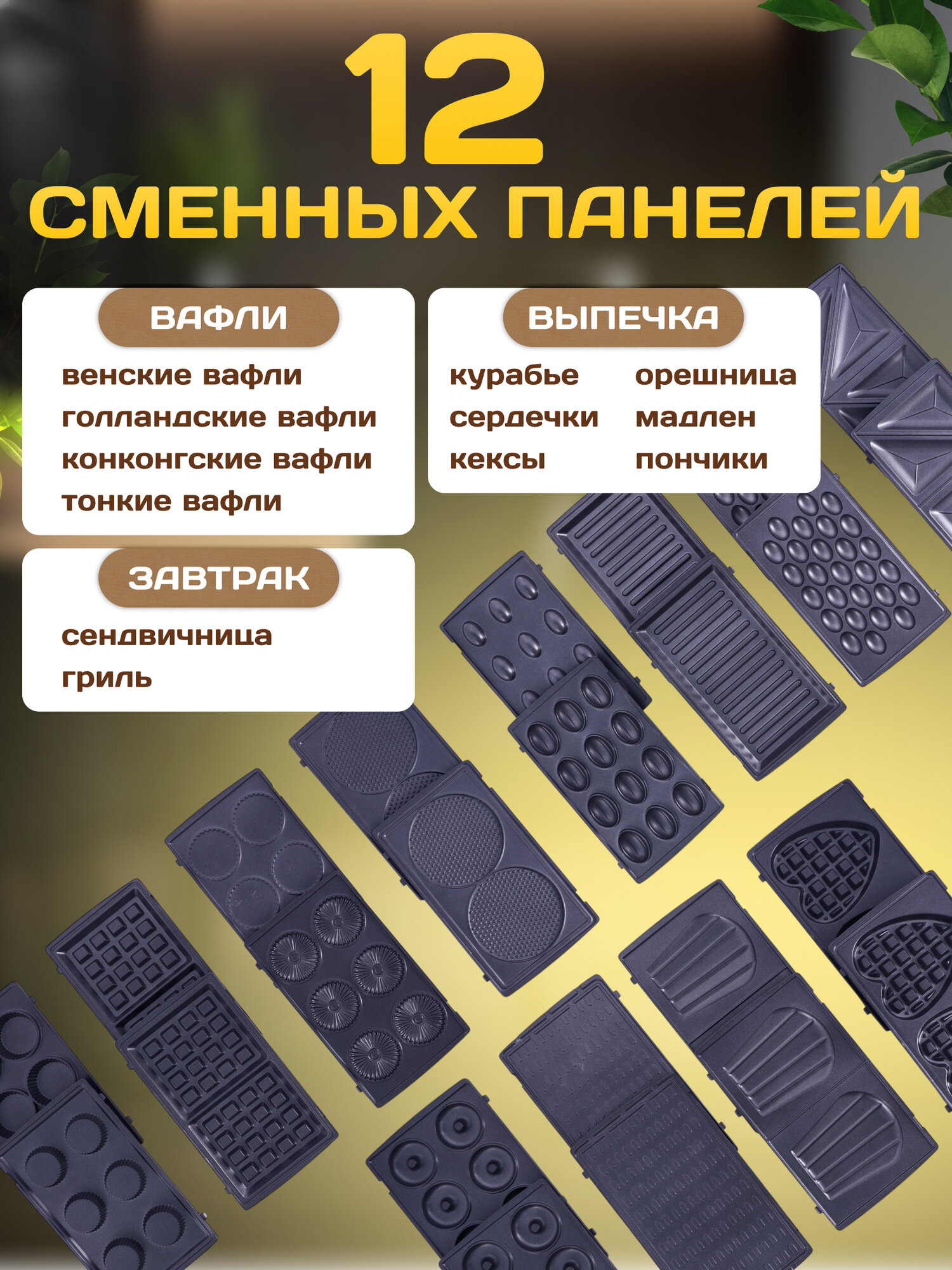 | Вид панели | вафли / выпечка и печенье / гриль / кексы / орешки / пончики / сэндвичи / хот-доги |