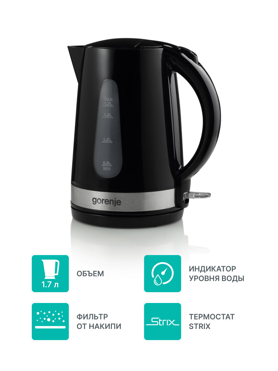 Чайник электрический Gorenje K17BK черный/серебристый, объём 1.7л, мощность 2200Вт, материал корпуса: металл/пластик информация: