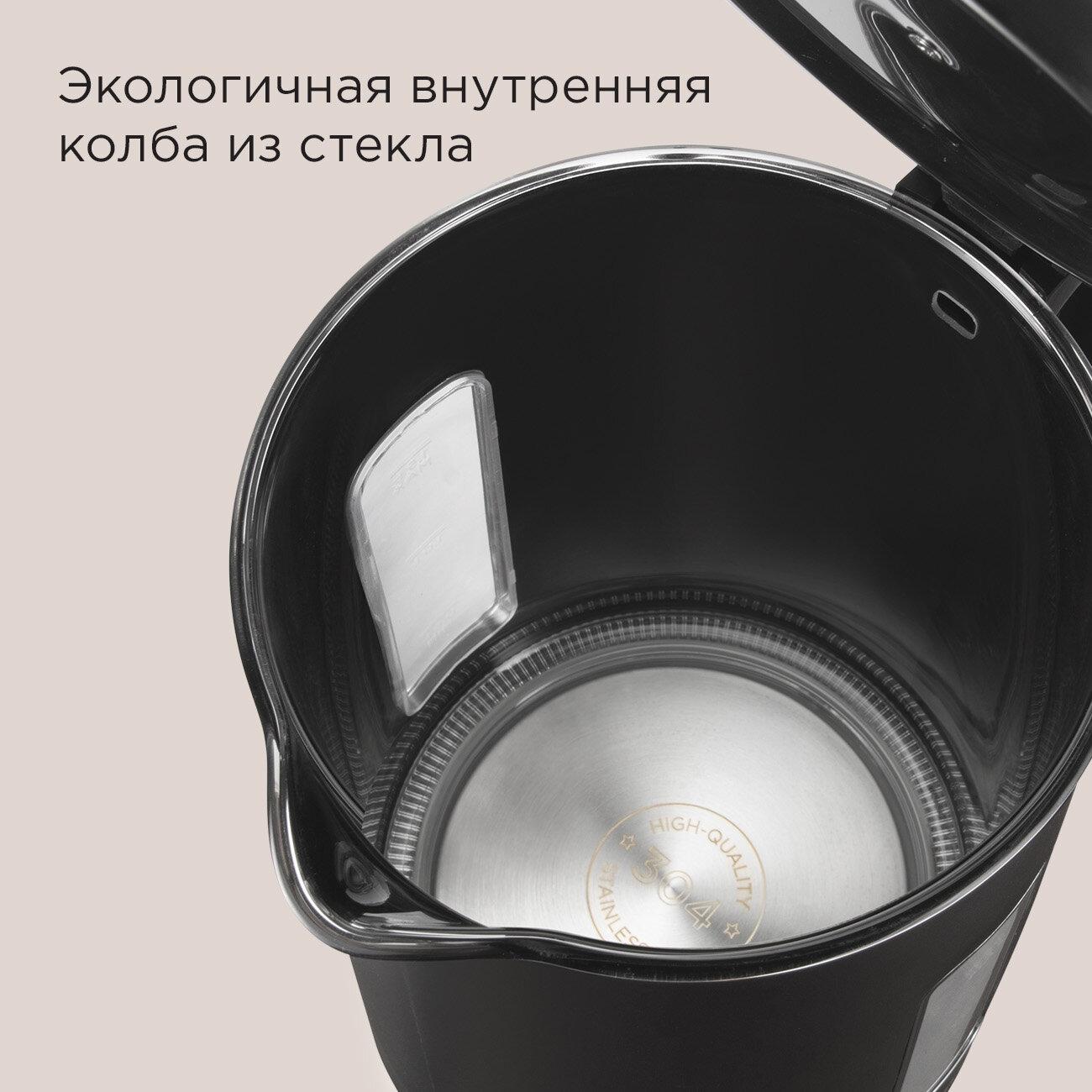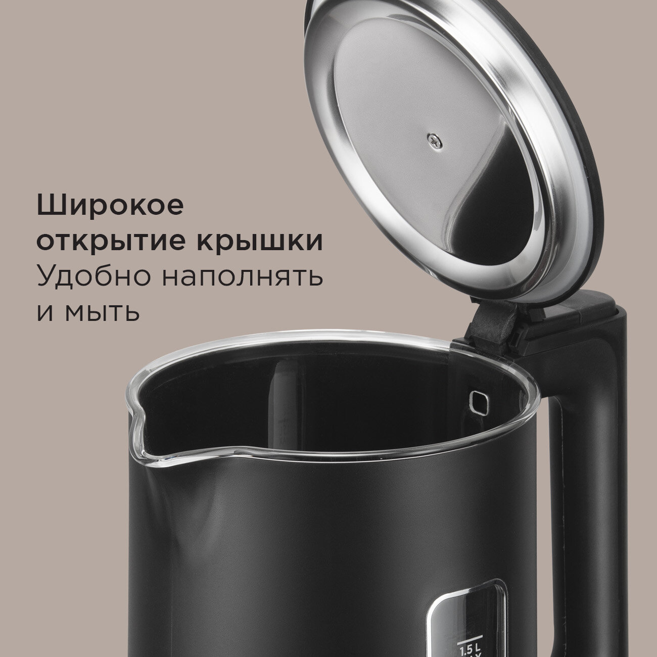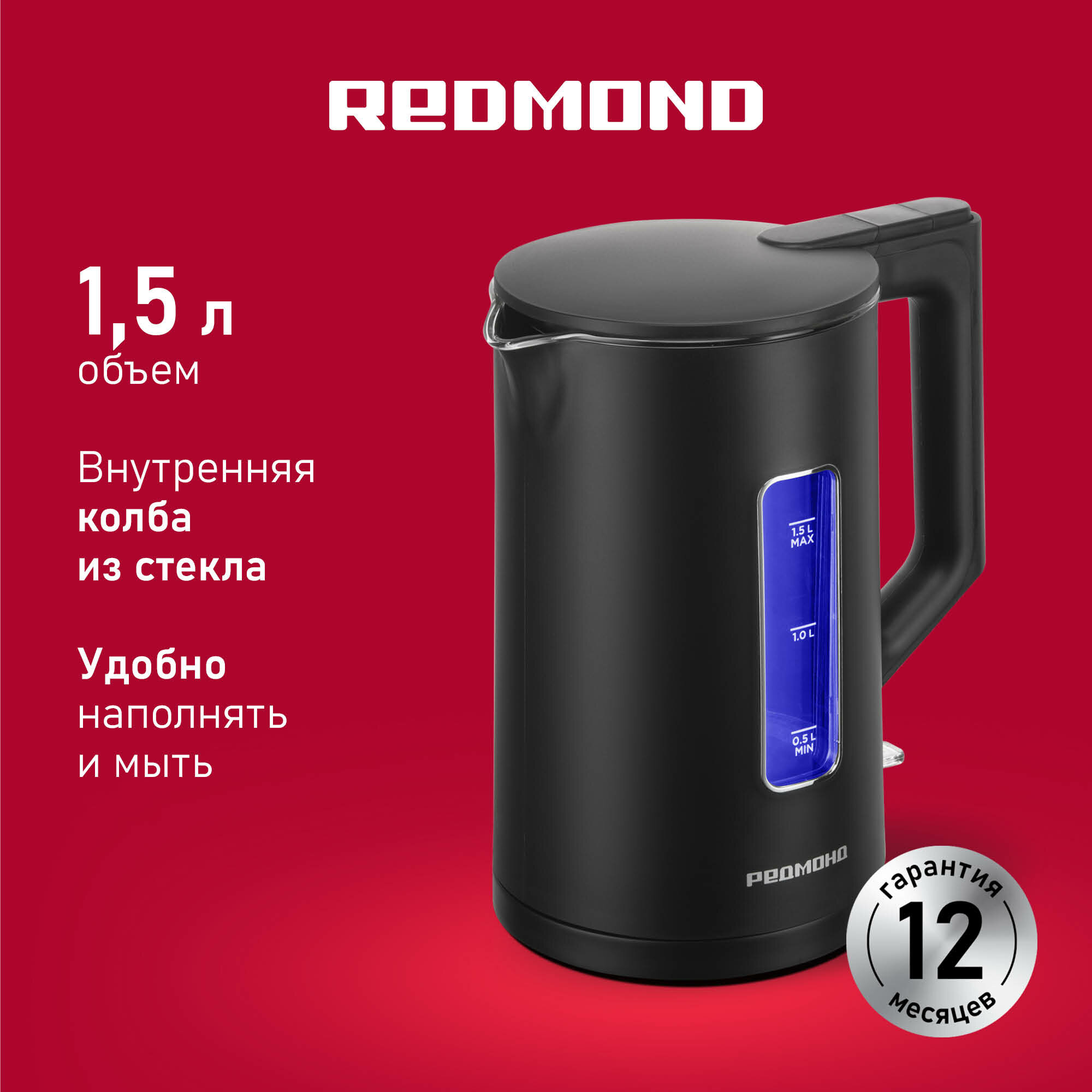Электрический чайник со стеклянной колбой РЕДМОНД KG255, 1,5 л, LED-подсветка, автоотключение, поворот 360°, черный информация: