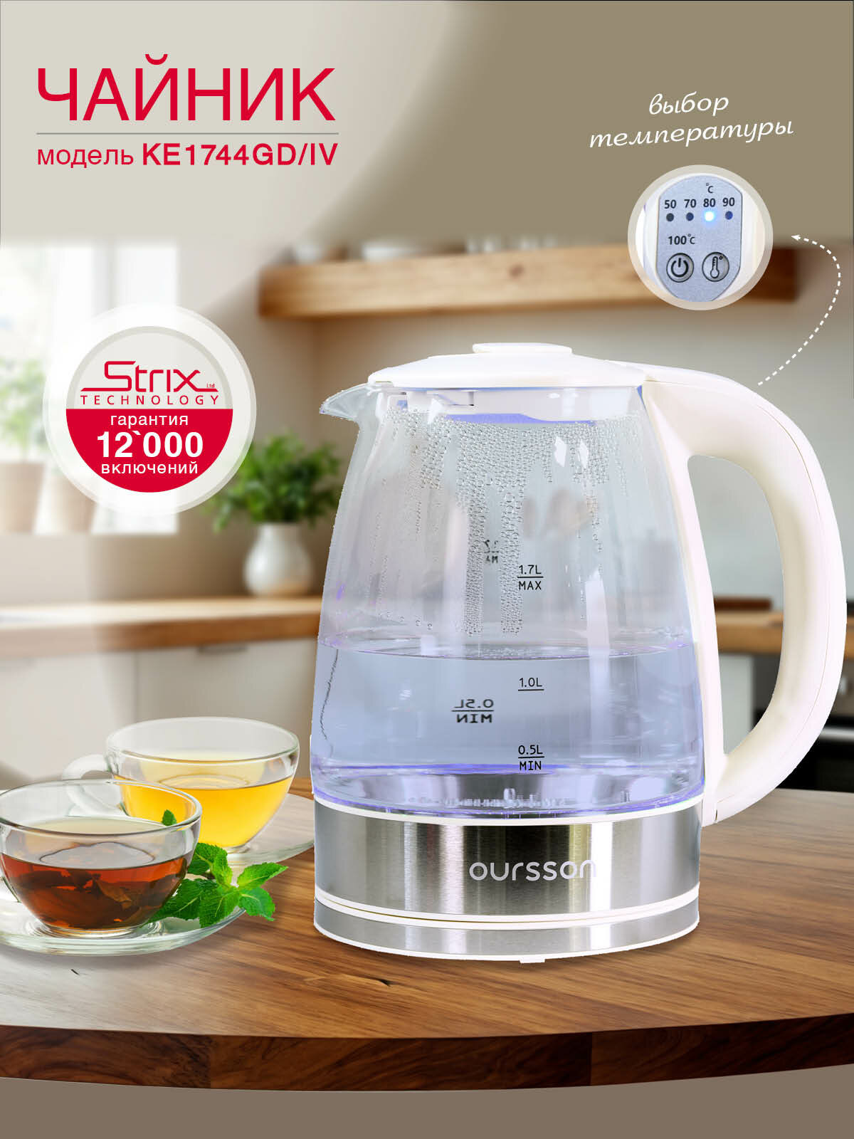 Электрический стеклянный чайник Oursson "KE1744GD/IV", 1.7л, 2200Вт, бежевый информация: