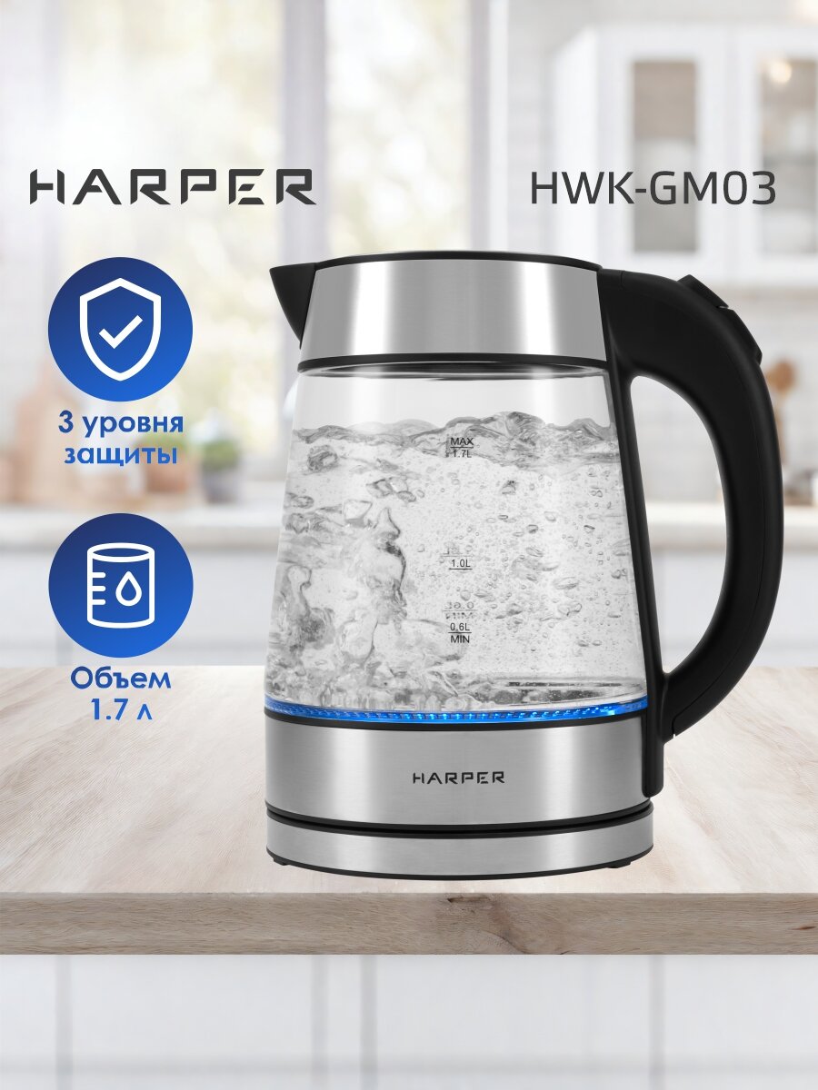 10 цен на Электрочайник HARPER HWK-GM03, серебристый (нерж. сталь)/прозрачное стекло