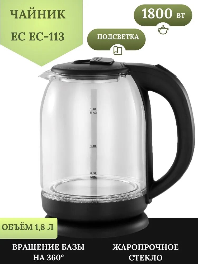 Чайник электрический EC EC-113, 1800 Вт, 1,8 л, стекло, черный информация:
