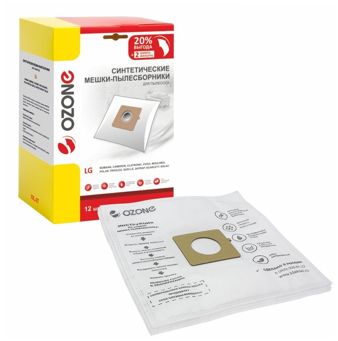 Мешки-пылесборники Ozone XXL-07 синтетические 12 шт + 2 микрофильтра для LG, EVGO, POLAR и др. информация: