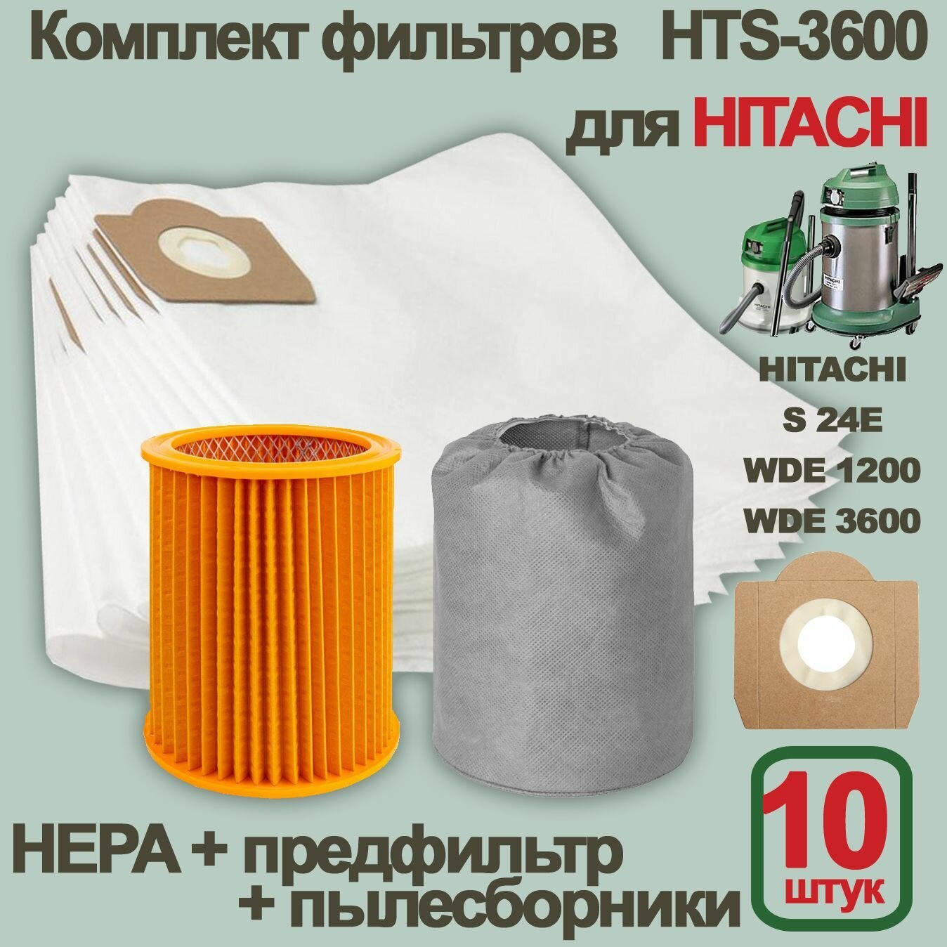 10 цен на Комплект HTS-3600 (10 мешков + HEPA-фильтр + предфильтр) для пылесоса HITACHI WDE 1200, WDE 3600, S 24E