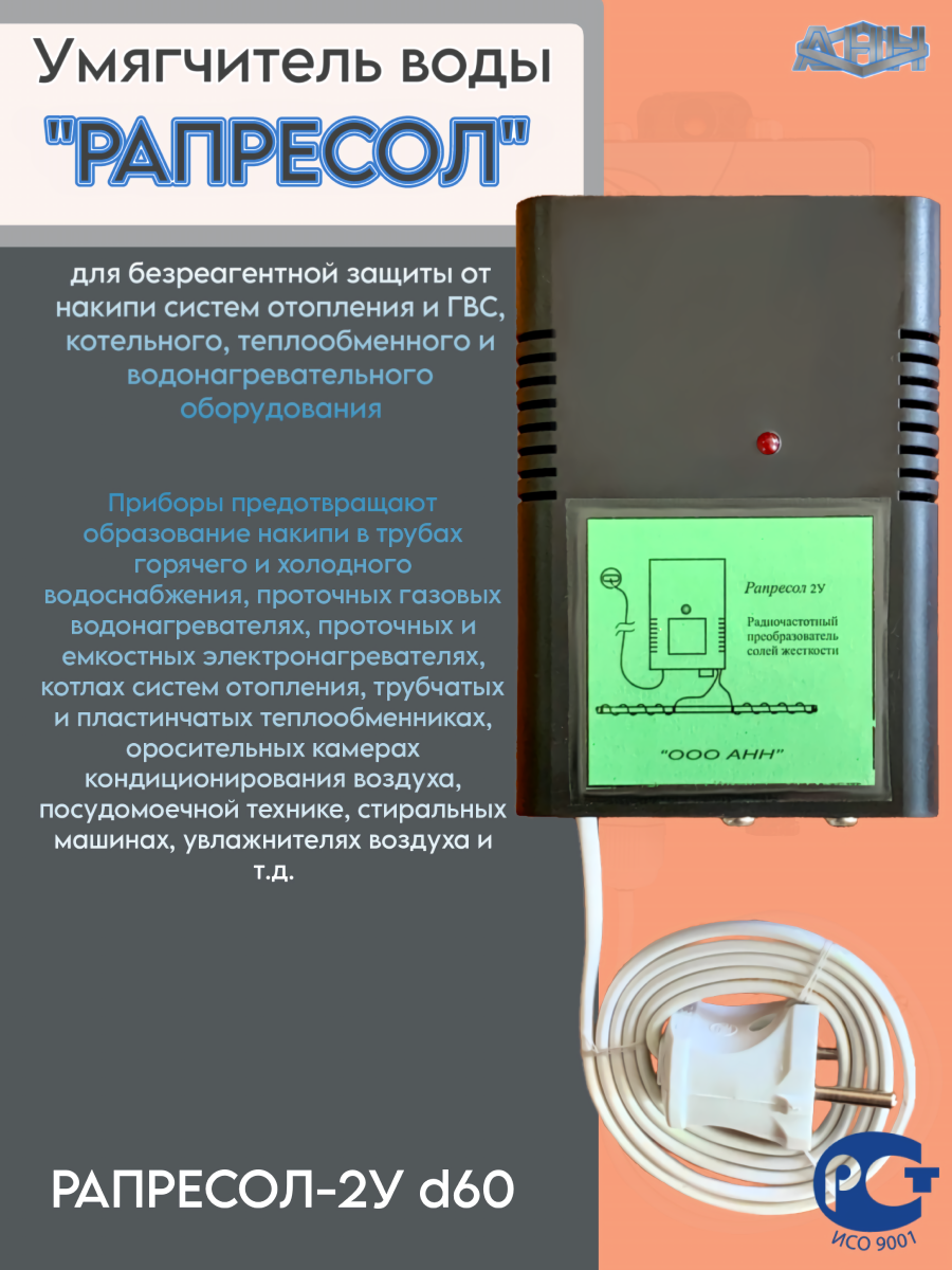 Прибор от накипи Радиочастотный (электромагнитный) преобразователь солей (умягчитель проточной воды) Рапресол-2У d60 информация: