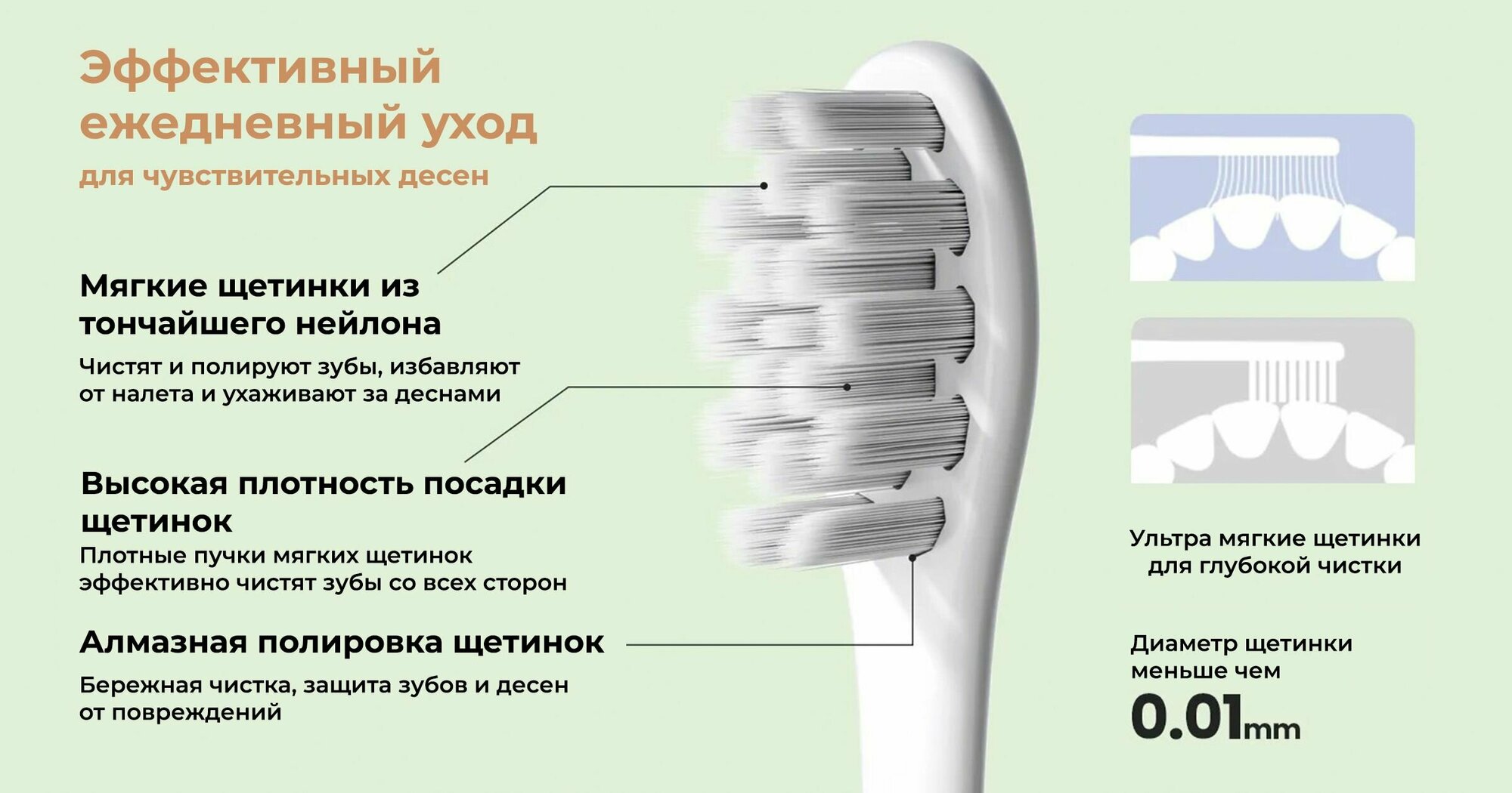 | Тип насадки | Деликатная чистка / Для чувствительных зубов / массаж десен / Насадка-щетка |