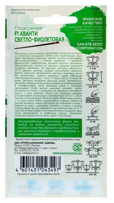 Гавриш Семена комнатных цветов Глоксиния Аванти "Cветло-фиолетовая", F1, 4 шт.