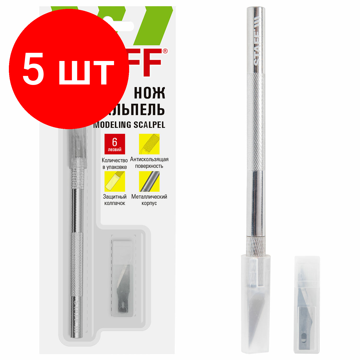 Комплект 5 шт, Нож макетный (скальпель) STAFF, 6 лезвий в комплекте, металлический корпус, блистер, 238258 информация: